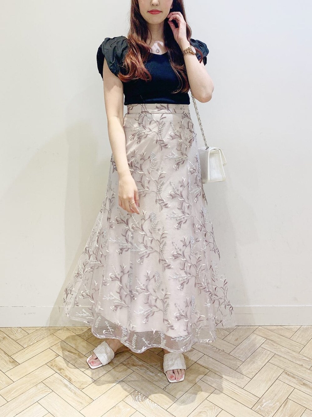 チュールスカートを合わせた大人フェミニンコーデに! トップスは、異素材スリーブでハリのある素材なので上品に着て頂きやすいです✨ 前後2WAYでも使って頂けます︎︎︎︎︎☺︎ スカートは、オリジナルの刺繍とチュールには程よいラメ感もあるので華やかさも演出してくれて上品に着ていただけます♡ 後ろのウエストはゴムなのも嬉しいポイントです✨