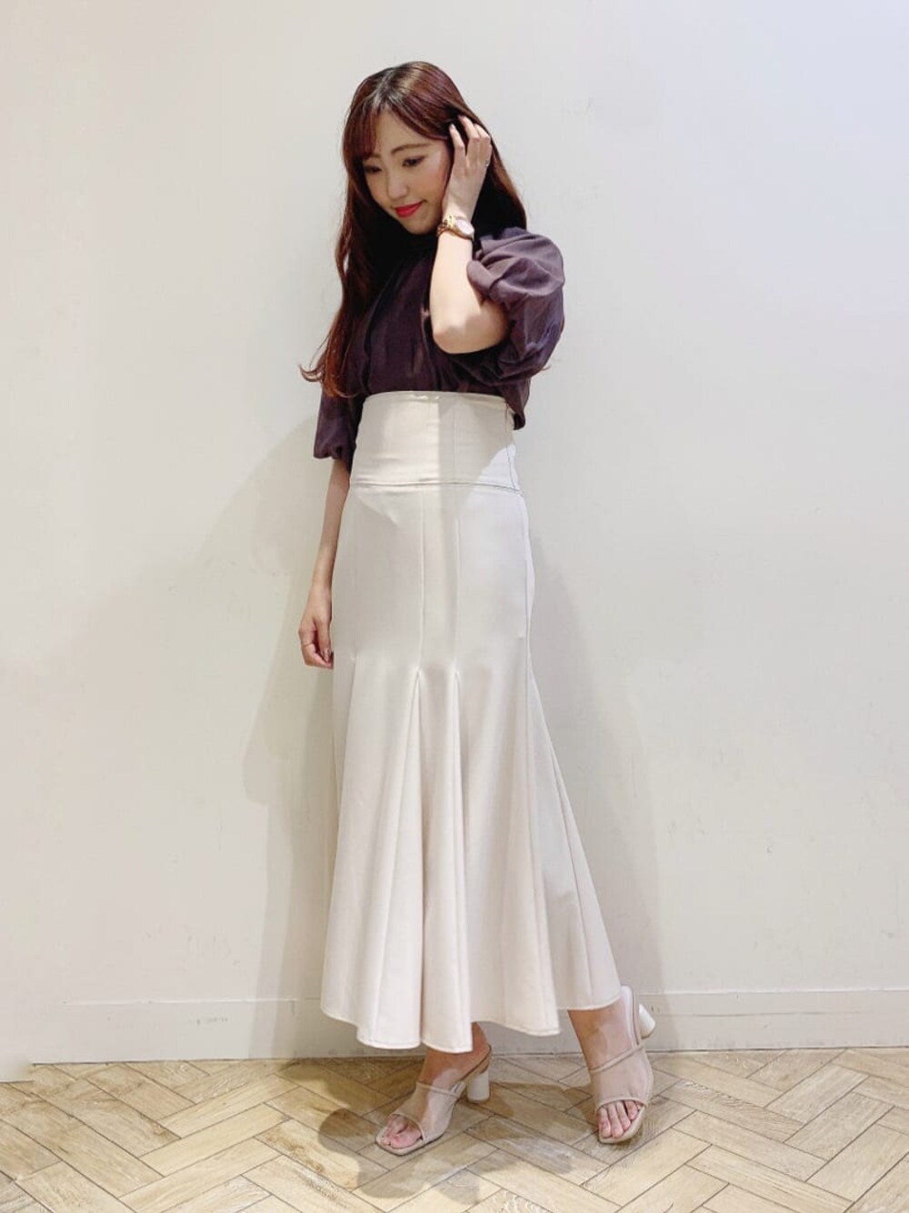 デートにもピッタリフェミニン過ぎない上品コーデ✨ ブラウスは、透け感がありシアー素材なのでトレンド感も◎!ビックリボンがポイント︎︎︎︎︎☺︎ 前後2WAYなので気分でリボンを前にして着ても可愛いです✨ インナーも付いているので透け感なども気にならず安心! スカートは、切り替えが高めなのでウエスト回りもスッキリ見え、足長効果抜群です♡ 後ろには、シャーリングでゴムが入っているのでインなどもしやすく楽ちんです︎︎︎︎︎☺︎ 季節問わずで使えるので1枚持ってるととても便利なスカートです♡