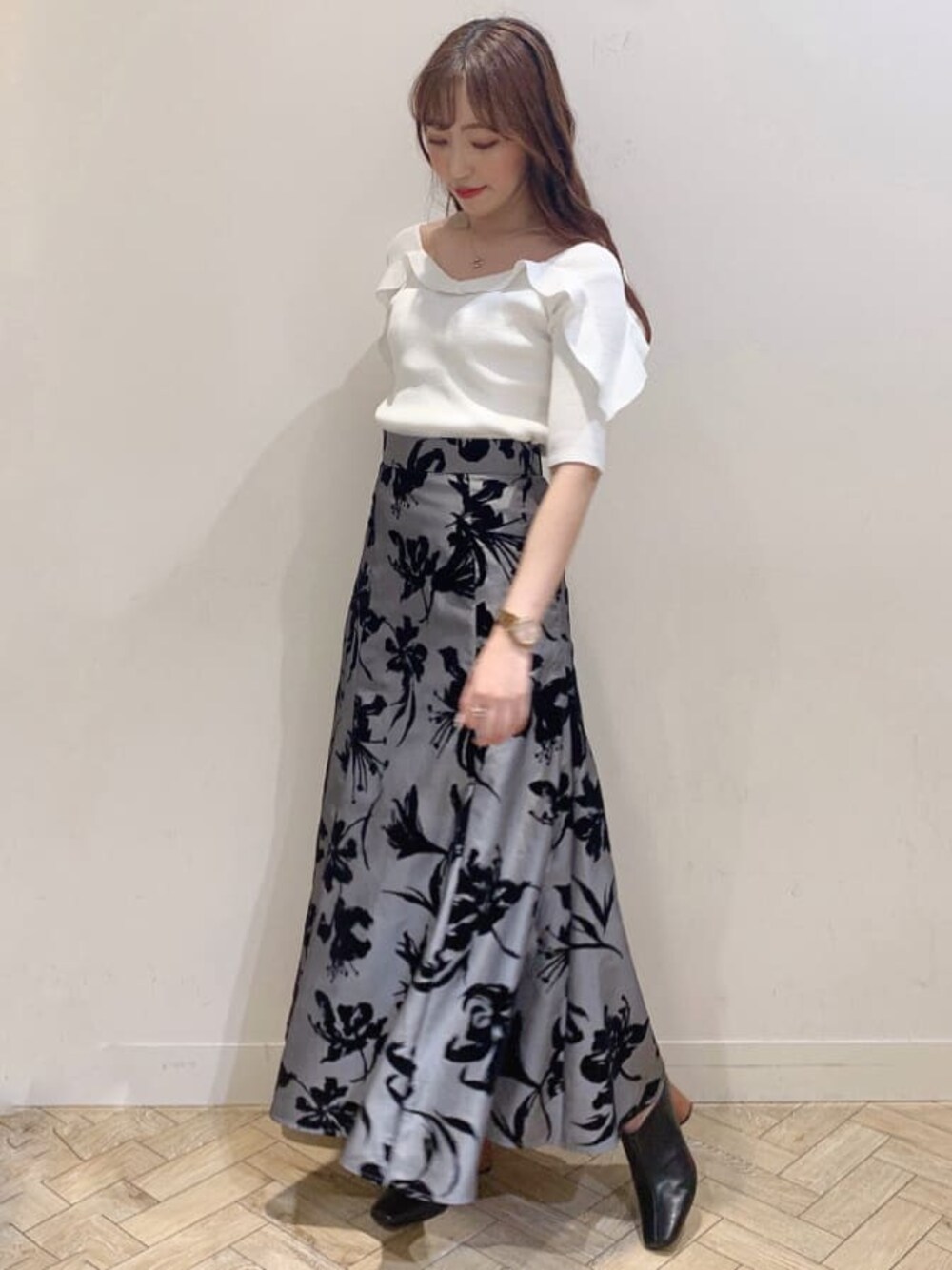 airi(dazzlin)のスカート「フロッキープリントフレアマキシスカート」を使ったコーディネート