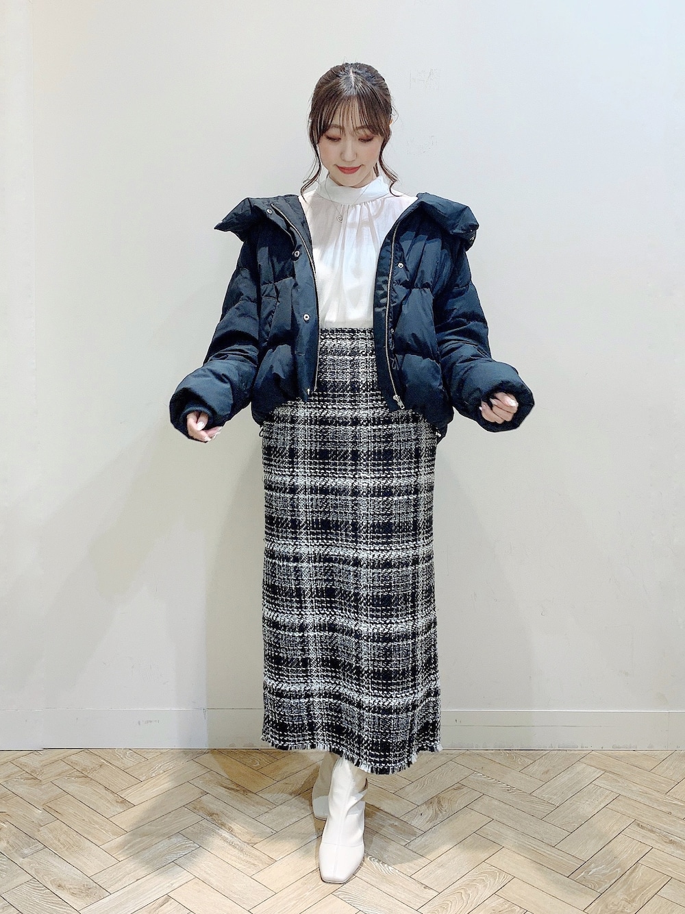 冬らしいツイードで大人上品コーデ♥ ブラウスは、前後2WAY! その日の気分で雰囲気も変えて頂けます︎︎︎︎︎☺︎また、程よい透け感とシアー素材なので女性らしさもアップしてくれます♩ リボンが前の方が可愛さアップ🤍🫶🏻 ブラウスは系統問わずで使えるので1枚持っておくと便利です♡ 春先まで使える優秀ブラウス✨ スカートは、ウエストがゴムなので楽ちんでニットもインしやすいです︎︎︎︎︎☺︎ 後ろには、深めのスリットが入っているのでとても歩きやすく、タイトすぎないのでラインを拾わなずシルエットもとても綺麗です❤︎ アウターは、毎年大人気のダウンコートで洗えます︎︎︎︎︎‼️ ダウン70%.フェザー30%なのでとても軽くて暖かいです🤍 中に着込んでもかさばらずに着れるのも嬉しいポイント︎︎︎︎︎✨ 裾にドロストが付いているので絞って頂くとよりスッキリ見えます♩