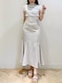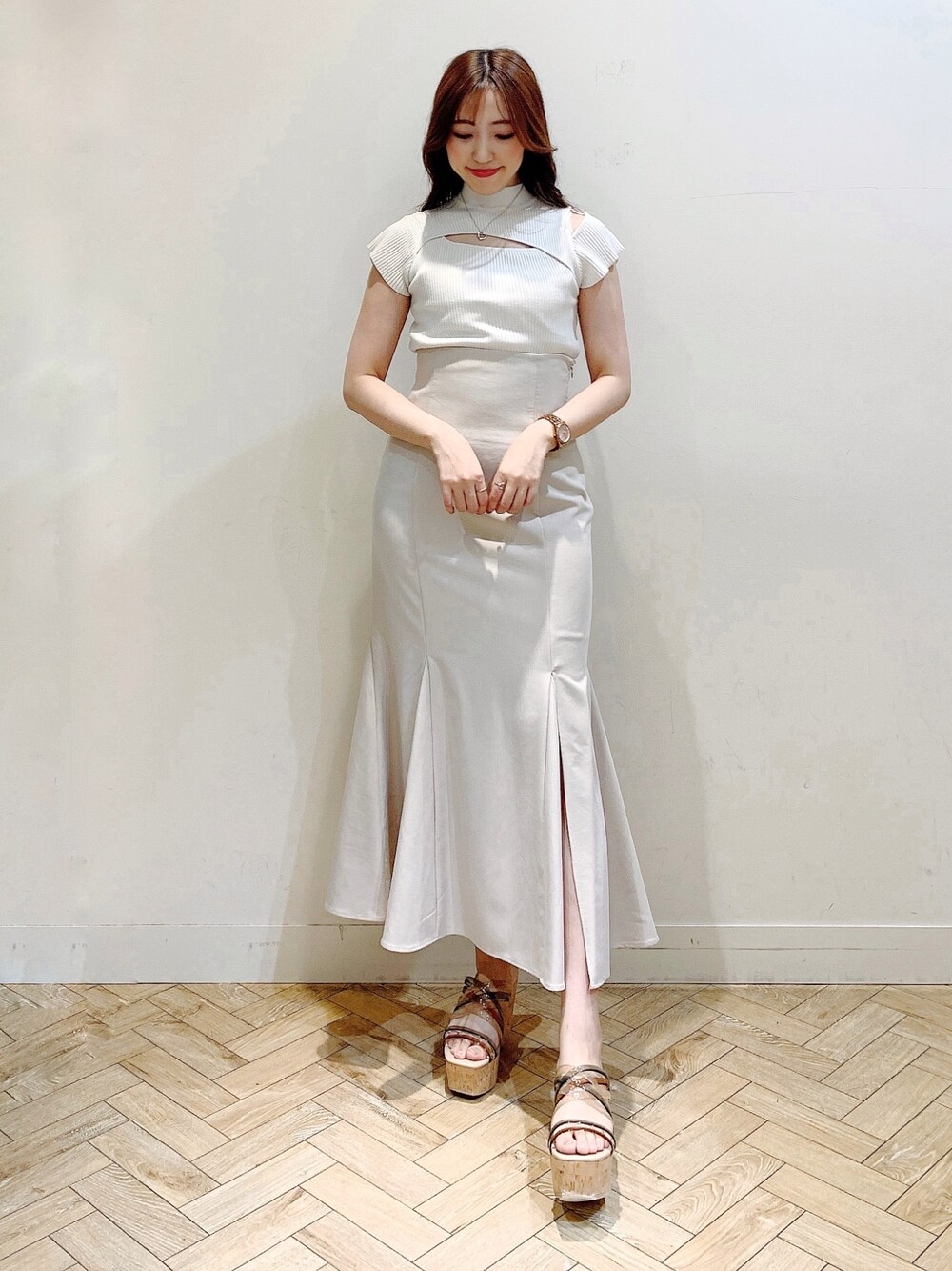 大人上品ワントーンコーデ︎︎︎︎︎☺︎ 大人気のニットがフレンチスリーブver.になって登場 ✨✨ 前後2WAYで首元にスリットが入ったデザインが女性らしさをアップしてくれます︎︎︎︎︎☺︎また、ボトルネックなので、大人っぽさもプラスに!! インナーを着ていても首元のスリットからインナーが見えないので安心です︎︎︎︎✌︎ リブニットで身体にそうのでスッキリ着やすいです❤︎ スカートは、美シルエットなマーメイドスカート︎︎︎︎︎に新色が加わり再登場💗 ハイウエストなマーメイドシルエットでスタイルアップ効果抜群です♩ バックシャーリングレースアップデザインなので、サイズ感も調節して着用ができるのが嬉しいポイント✨ サンダルは、毎年大人気のクリアチューブサンダル👡🤍 1日履いていても足が痛くならない神サンダル♥ 高すぎない傾斜と軽いウエッジソールなので、履き心地🙆♀️で脚長効果も抜群です♩ 洋服問わず使えるので1足持っているととても便利です✨