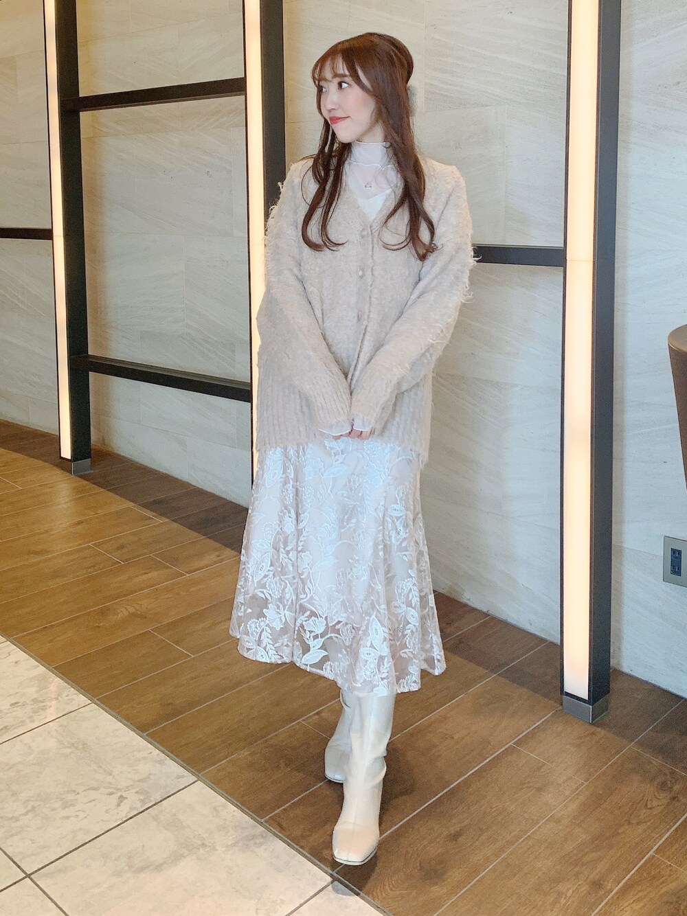 デートコーデにもピッタリ春らしい大人フェミニンコーデ🌸 トップス インナーがついているので透け感を気にせずに着れる1枚!! 程よい透け感が女性らしさをプラスしてくれます✨️ カーディガン 毛足が長いシャギーのカーディガン❤︎ カーディガンとしても、レイヤードスタイルで インナーを着てトップスとしても🙆♀️ お尻回りが隠れる丈感なのでスッキリ見えが叶います☺︎ スカート リーフ柄をモチーフにした華やかなレーススカート︎︎︎︎︎☺︎ ボリューム感を抑えているので、シルエットがとても綺麗で 女性らしさを演出してくれます☺️ ウエスト部分もゴムなので楽ちんです! ブーツ 24.5cm Lサイズ着用 つま先が少し細身なスクエアトゥブーツ! ヒールは8cmありますが、安定感があるので 1日履いていても足が痛くならない優秀ブーツ