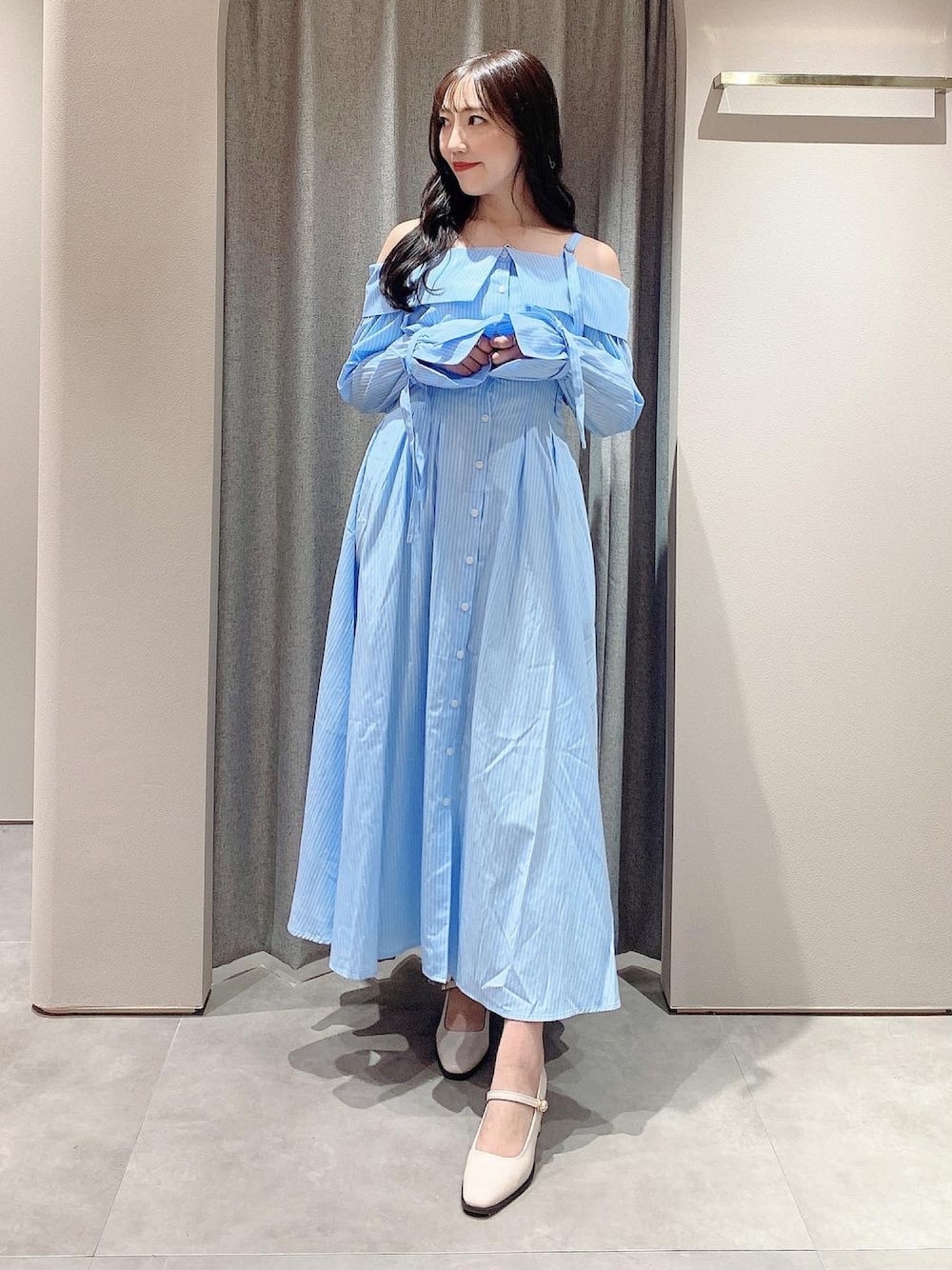 airi(dazzlin)のシャツワンピース「ウエストタックオフショルシャツワンピース」を使ったコーディネート