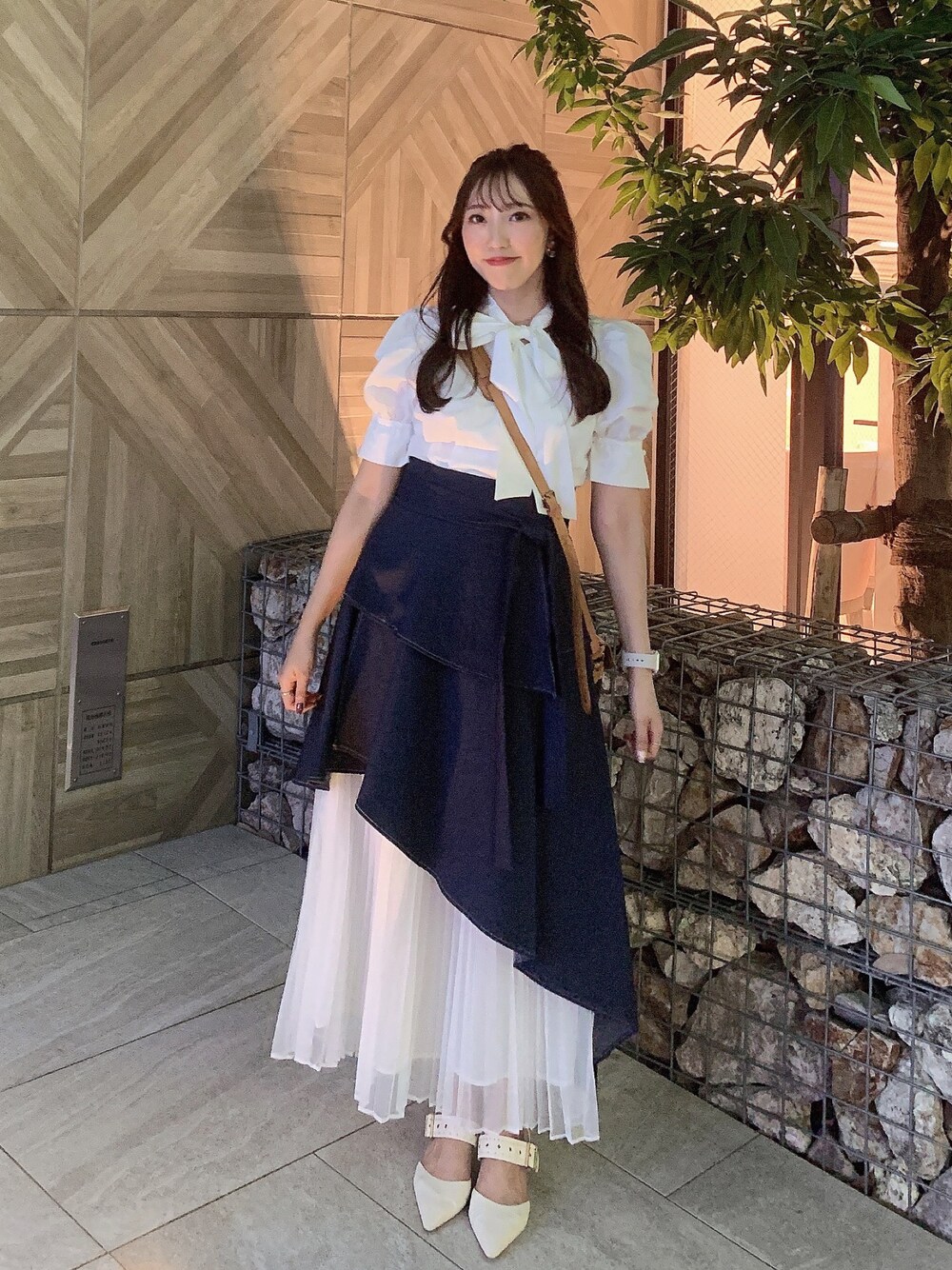 dazzlinらしい大人フェミニンコーデ🪄 ブラウス 定番のボウタイブラウス! リボンが大きいのが可愛くポイント🎀 ウエスト部分はゴム仕様! ペブラムシルエットなので、アウトでパンツスタイルなどに 合わせるのもおすすめ✨️ また、ジャケットの中のインナーとしてきても🙆♀️ スカート 去年大人気だったプリーツスカートがバージョンアップ💡 ペブラムシルエットでオシャレ度アップ✌︎ そして、ヒップラインもカバーしてくれる着痩せ効果も抜群☺️ 裾がプリーツなので動く度揺れ感も可愛いです︎︎︎︎︎☺︎