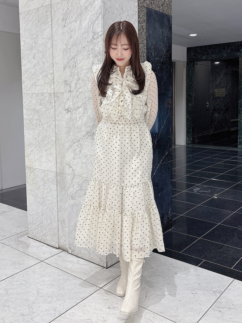 ワンピース ウエストがシャーリングゴムなのでとても楽ちんなワンピース!! ふわふわ感と透け感か程よい抜け感を演出し甘すぎず大人っぽく仕上げてくれます🪄 着用画像のアイボリーはハート模様が珍しいデザイン♥ シューズ 24.5cm/Lサイズ ヒール8.5cm(サイズによりヒールの高さが異なります。) スクエアトゥと程よいヒールの高さなので、スタイルアップを叶えつつも安定感があるのでとても履きやすく歩きやすいです!