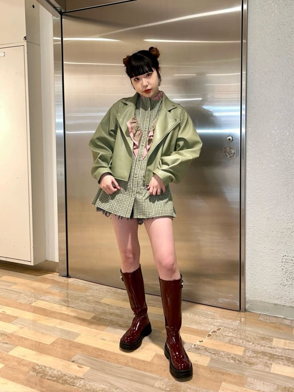フリルレースシャツとタックスリーブライダースのコーディネート❤︎ スタンドカラーやたくさんのフリルとレースがかわいいブラウスはカラーごとに配色が違く、自分の好きな系統に合わせて選べる様になっております☺︎ゆったりしたスリーブと、丈感も156センチの私でヒップが隠れる丈感なので、一枚にロングブーツがおすすめ◎ロングボトムが好きな方はインするとまた違ったシルエットになるので色々な着こなしが楽しめる一押しのアイテムです‼︎‼︎