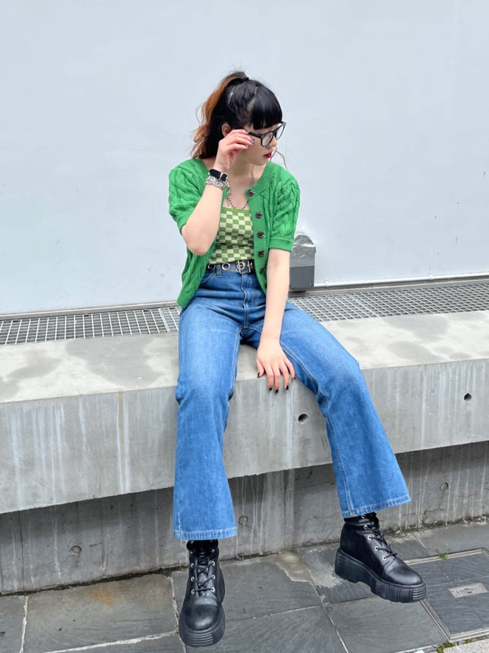 JURI(jouetie)のサングラス「ワイドフレーム伊達メガネ【くもり止め加工レンズ】」を使ったコーディネート