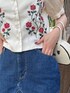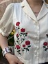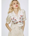 jouetieならではのローズ刺繍とパフスリーブがかわいいブラウス❤︎サイズ感もコンパクトでデコルテも綺麗に見える襟になっています♪前ボタンを開けることができるのでキャミソールやチビTにかさねて羽織で着用しても!!程よい光沢感のあるサラッとした生地感で、夏でも可愛くブラウスを着ることができます☺︎もちろんタイトなタートルネックやハイネックのシアートップスをレイヤードして合わせて着ても◎