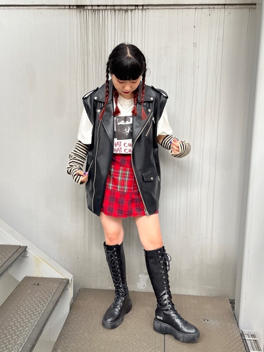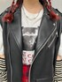 大人気の2WAYライダース!袖を外してベストで着用しました♪お尻も隠れるゆったりサイズでロングボトムはもちろんミニボトム×ロングブーツ合わせがとってもおすすめ!コラボTシャツはとってもオーバーサイズでプリントと刺繍が贅沢なデザイン、メンズでもゆったり着れるサイズ感なのでお揃いでも❤︎アームウォーマーとタックスカパンはあえて柄×柄合わせに☺︎おすすめの組み合わせです◎