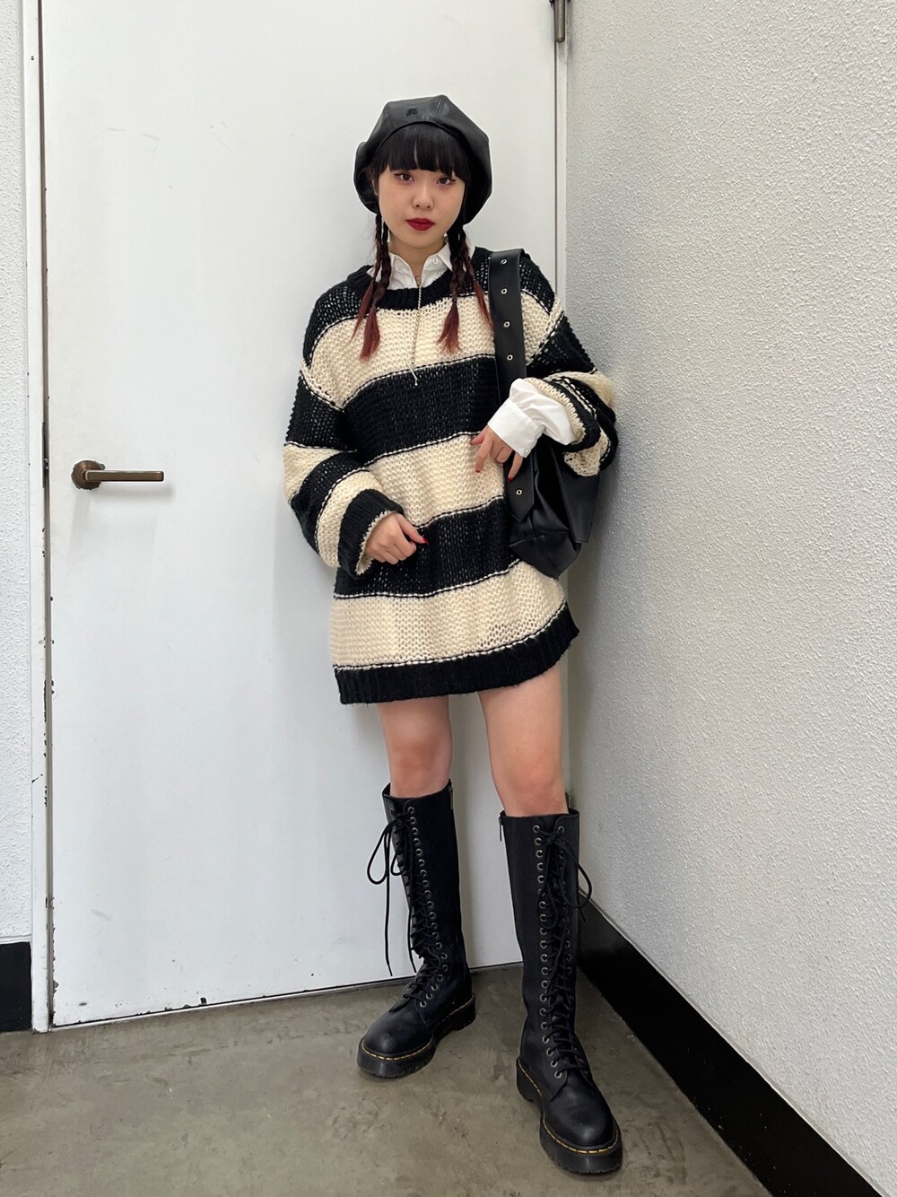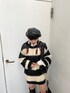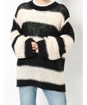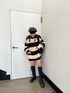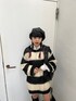 レイヤードコーデ【ニット】オーバーサイズのローゲージニット、太めのボーダーがグランジテイストにピッタリ◎丈はインナーのショートパンツが隠れるくらいです!【シャツ】サイドがリボンになっている大きめサイズのシンプルなアイテム♫胸元のJTの刺繍がかわいいポイント☺︎