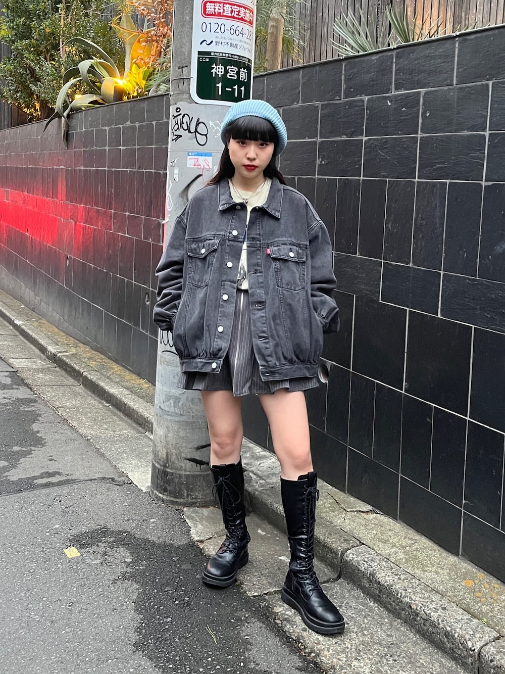Gジャンコーデ【アウター】オーバーサイズでゆったり着用できます、どんなテイストにも合わせやすく一枚あると大活躍するアイテム♪【スカート】プリーツの可愛さとフロントのジップが甘さを抑えて一枚で甘辛ミックスなスカパンインナーがついているので安心して着用できます!
