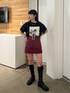 Tシャツコーデ【トップス】ビックサイズで一枚でも着用可能なアイテム♪インナーを入れ手もかさばらずハイネックトップスやシアートップスと合わせても◎布団との大きいプリントがポイントになるのでアウターを羽織ってもバランスよくコーディネートできます!【スカート】太めのベルトとステッチがかわいいアイテム!大きめのポケットが実用的で、どんなテイストにも合わせやすく使いやすいスカートです♪