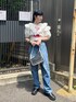 ブラウスレイヤードコーデ【ブラウス】短い丈感のフリルの存在感がしっかりあるブラウス、レイヤードにおすすめのアイテムで、Tシャツや、キャミソール、冬はタートルなどがかわいいです♪【デニム】サイドのストーンのキラキラがジュエティならではのアイテム、サイズ感はストレートで使いやすいです!ロールアップして丈感を調節して履けます!
