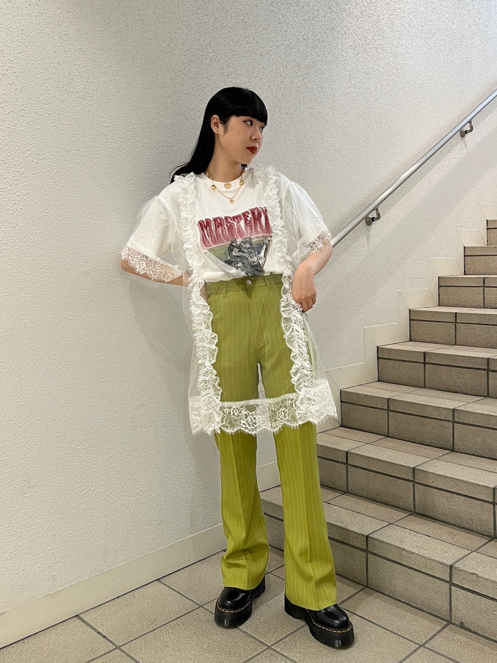 レイヤードコーデ【トップス】たっぷりのフリルと透け感の可愛いミニワンピース、ミニが苦手な方もロングパンツと合わせて使っていただくのがおすすめです◎袖や丈感も長めになっているので体型カバーも♪【ボトム】薄目の生地感のロングパンツ、センタータックが脚を長く見せてくれて、裾がフレアになっているのでバランスよくコーデができるアイテム!