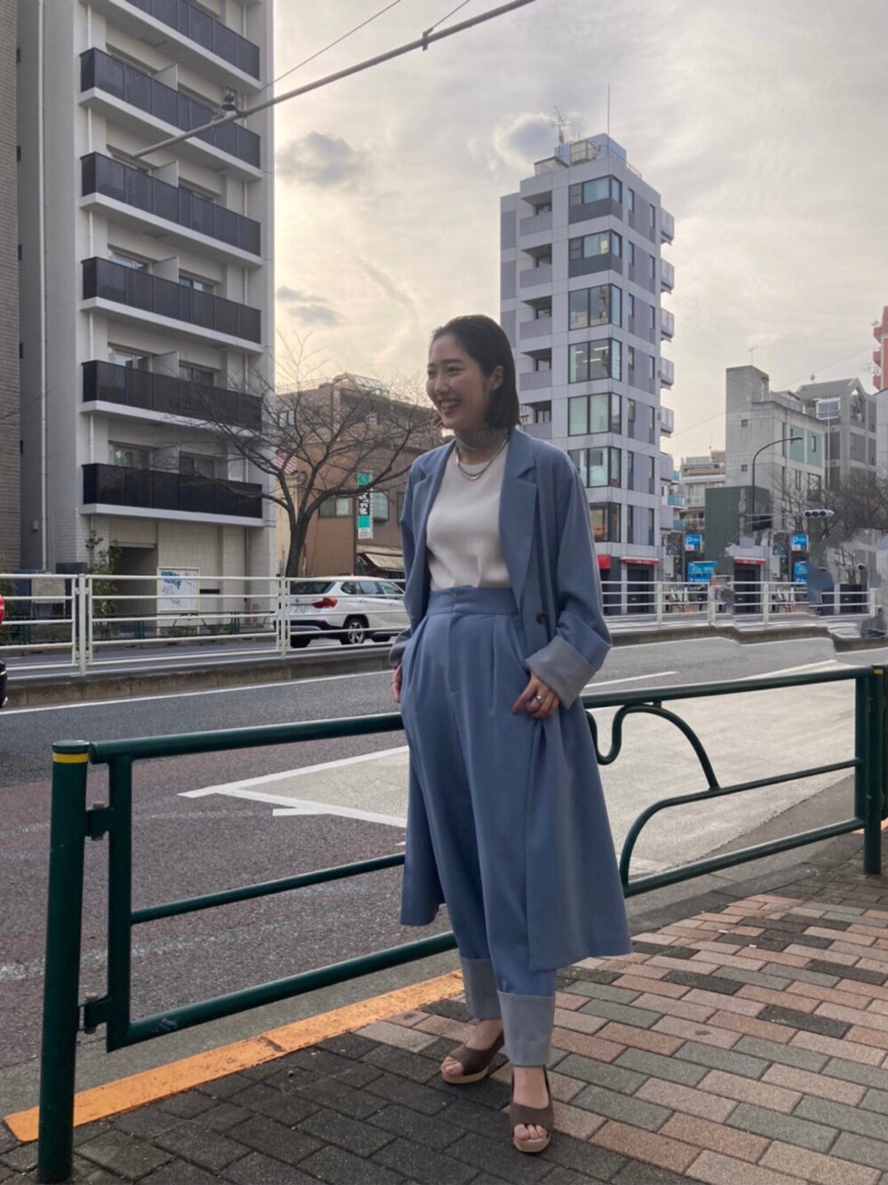 バイカラーが特徴のセットアップコーデ。もちろん別々でも着れるので着回し抜群!形はシンプルで使いやすいですが、バイカラーなのでお洒落見えします。またくすみブルーなので派手すぎずに大人っぽい印象で着て頂けます! パンツのセットアップはかっこよくなりすぎてしまうのでスカーフとネックレスの重ね付けで女性らしさ出しました♪ パンツは落ち感のある生地に加え、ウエストにタックが入っているので脚長効果抜群。ロングコートと合わせるとさらにスタイル良くすっきりと見えます○。