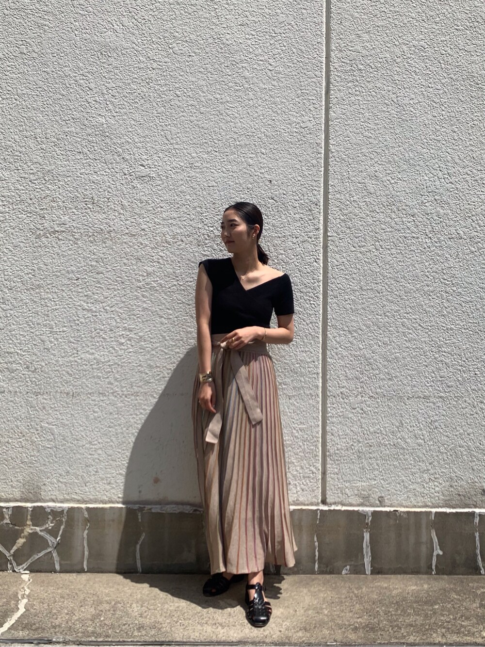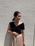 2wayで着れるアシンメトリーがポイントのニット!少し肩を落として綺麗めに着用してみました!デコルテがとっても綺麗に見えるので黒でも強すぎず女性らしい印象に◎。 店頭でも大人気の色鮮やかな目を惹くスカートは、小さなラメが光に当たるとすごく可愛い!また、しっかりとウエストマークされているので、体のラインをきれいに見せてくれます。 スカートのデザインを引き立てるためにトップスはシンプルなものがオススメです!