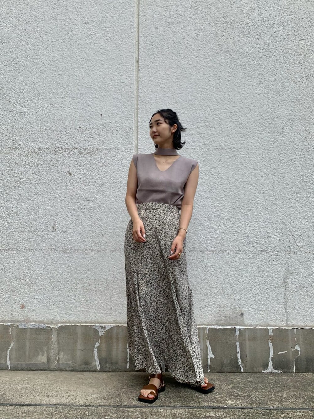 レーヨン混のニットを使用したトップスは真夏でも汗がべタつかず着心地抜群なアイテム!ボウタイは前でクロスし後ろで結んでも、前で一回結びにしブラウスっぽくしても◎。その日の気分やスタイリングに合わせて変化させられます!フレンチスリーブになっているのでノースリーブが苦手な方でも挑戦しやすい肌見せアイテムです。 ロングスカートには首元がすっきりとしたトップスを合わせるのがおすすめ。 こちらのナロースカートは店頭で今1番人気なスカート!ハイウエストデザインなのでスタイルアップ効果があります。 ウエストゴムなので楽なのはもちろん、ポケットもついているので機能性も抜群!そして他には無い柔らかくサラッとした生地感!是非一度着用していただきたいです!Tシャツにスニーカーと合わせても、ブラウスにパンプスでも可愛い♡