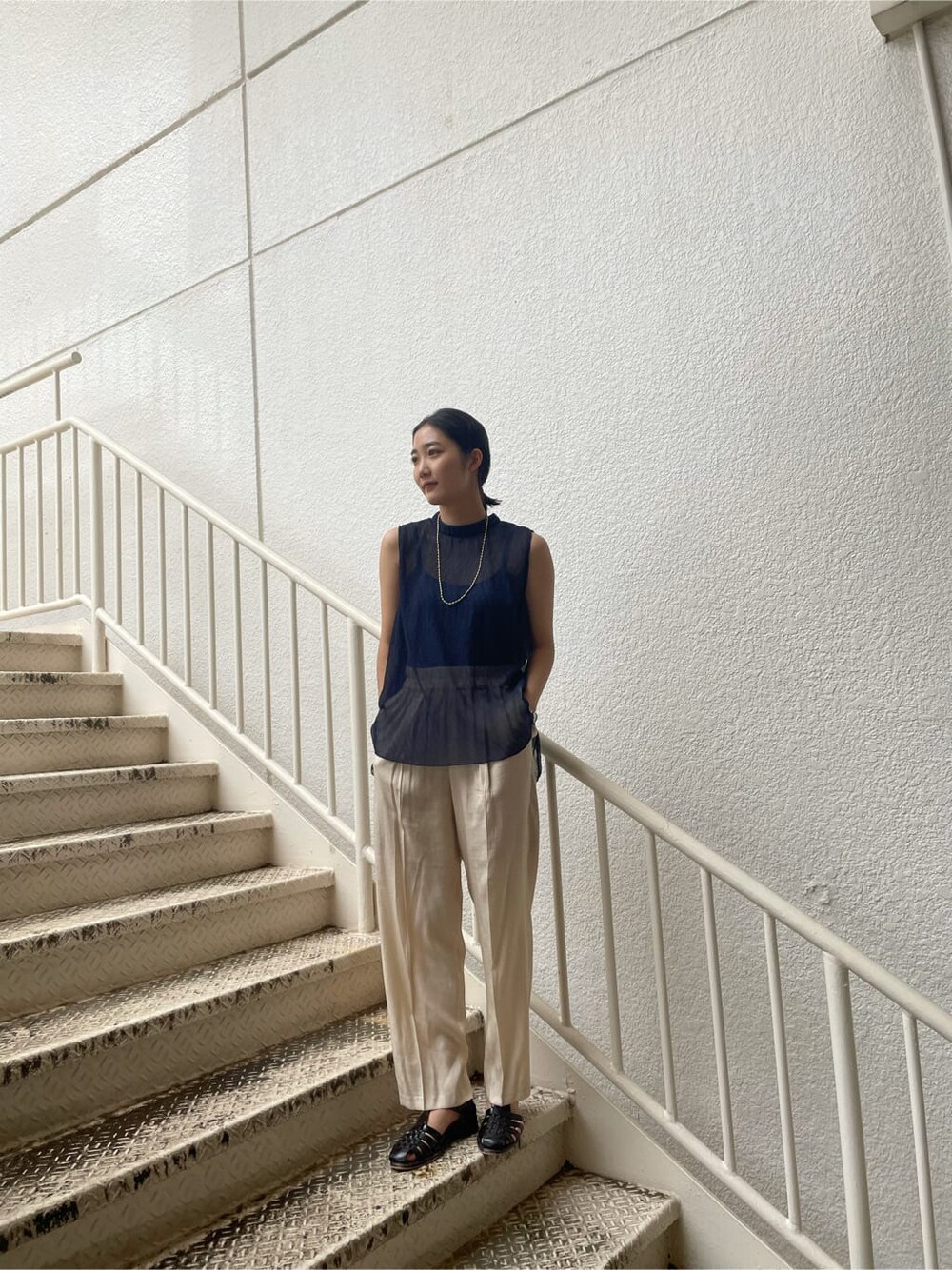 シワ加工が施された素材を使用したシアーブラウス!インナーのキャミがセットになっており、透け感がトレンド感溢れるスタイリングにしてくれます。裾がメローのデザインなのでインでもアウトスタイルでもオススメです。後ろの丈が少し長くなっておりお尻を隠してくれるのも嬉しいポイント!伸縮性にも優れているのでとても着心地がいいです♪ 合わせたサテンパンツは微光沢感のあるしなやかなサテン素材を使用しておりとっても軽く履き心地抜群!裏地が膝までなので真夏もさらりと着ていただけます。 アクセサリーはネックレスにもマスクチェーンにもなる優れものです!ヴィンテージ感のあるゴールドが馴染みやすくて使いやすい!