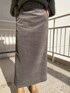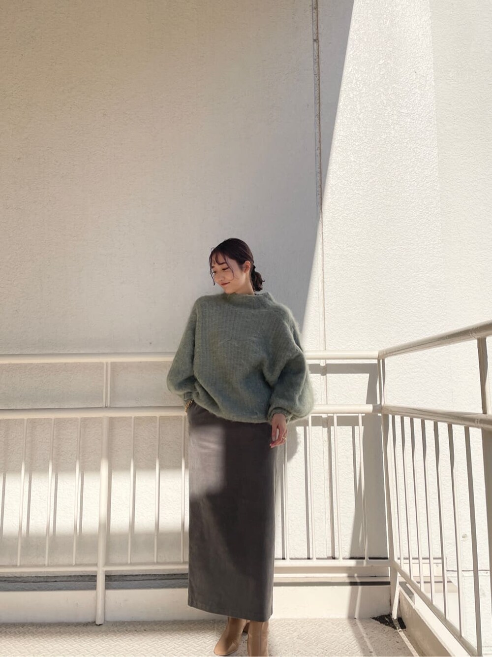 くすみトーンでまとめたコーディネート! 【トップス】アルパカ混の糸を使用した冬感のあるニットプルオーバー。袖のフォルム感が女性らしいシルエットで可愛い♡ 【スカート】伸縮性のあるコーデュロイを使用した動きやすさを兼ね揃えたアイテム! 後ろに深いスリットが入っているので小柄な方でも挑戦しやすいです。生地感もしっかりしているので下着のラインが全く見えないのもポイントです。すっきりとしたタイトシルエットなのでボリュームのあるトップスとスタイリングがおすすめ!!