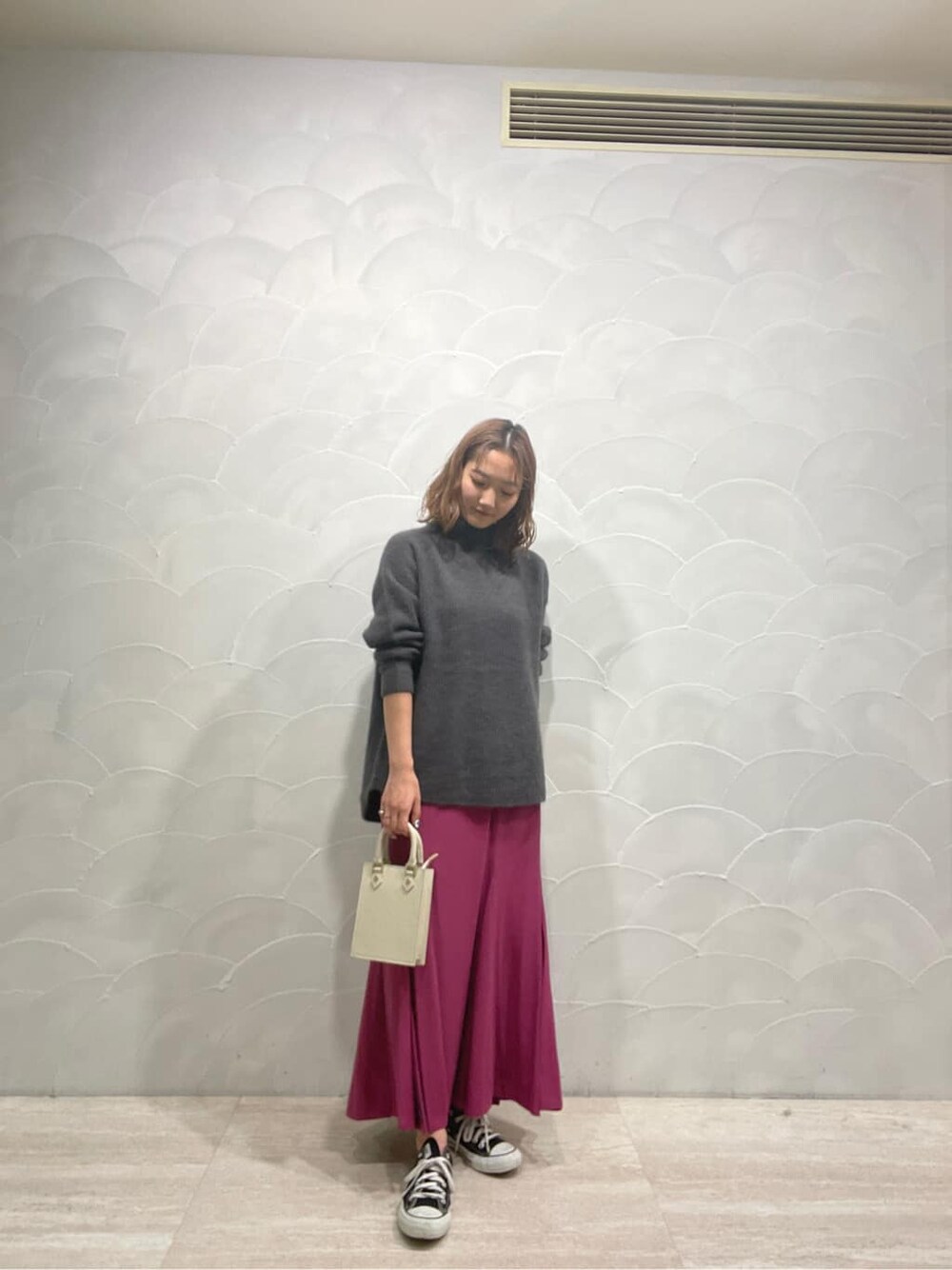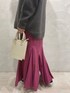 ビビッドなピンクが目を引くリラックスコーデ。 【トップス】密度が高いラクーンを使用したニットはとっても暖かいのが特徴!本当に着心地が良く全くチクチクしません!ふわふんとしたニットなので暗い色でも柔らかい印象で着ることができます。 【スカート】差し色にぴったりな鮮やかなピンクが可愛いスカート♡スッキリとしたシルエットなのでオーバー サイズのトップスを合わせるのがおすすめ!後ろに深めのスリットがはいっているためロング丈でも重く見えないです。