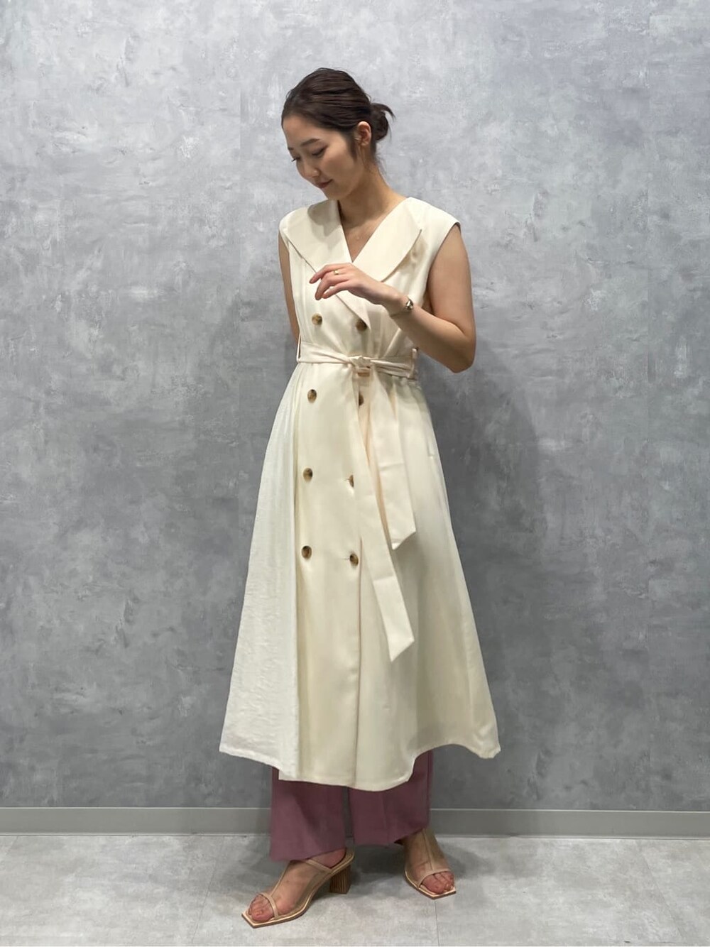 トレンドのレイヤードスタイル。 【ワンピース】羽織としてもお使いいただけるワンピース。デニム×Tシャツのカジュアルなスタイリングに羽織るだけでお洒落見えします。ウエストも絞れるのでスタイルアップ◎。生地もしっかりしているのでアイボリーでも透けずに着用できます。【ボトムス】 手洗い洗濯可能なレーヨン混素材を使用しているため、サラッとした涼しい履き心地!夏も大活躍間違いなしです 。コルセット風のウエストマークが腰周りのシルエットを綺麗に見せてくれ脚長効果も抜群。【シューズ】メッシュ素材を使用した履くだけでおしゃれ見えするパンプス。丈の長いアイテムでも足の甲が見えるデザインなので使いやすいです!