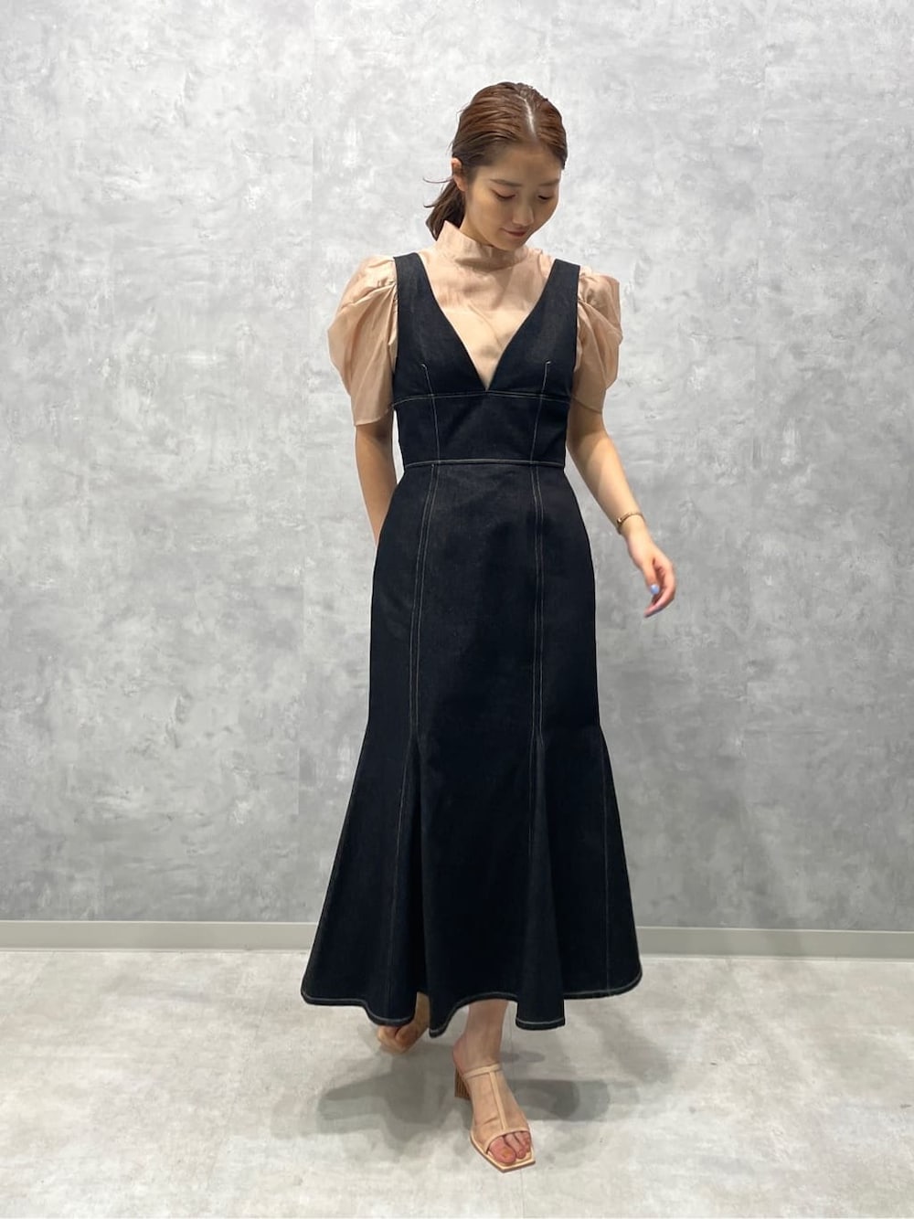 カラーブラウスをポイントにしたコーデ。 【ワンピース】着るだけで細く見せてくれるデニムジャンパースカート。マーメイドスカートが綺麗に体のラインを見せてくれます。甘めが苦手、、、という方でもブラックなら挑戦しやすい!シンプルなTシャツと合わせても可愛いです! 【ブラウス】パフスリーブとシアー素材が特徴のブラウス。インナーキャミソール付き◎。程よい透け感なのでオフィスでも使いやすいです!【シューズ】メッシュ素材を使用した履くだけでおしゃれ見えするパンプス。丈の長いアイテムでも足の甲が見えるデザインなので使いやすいです!