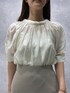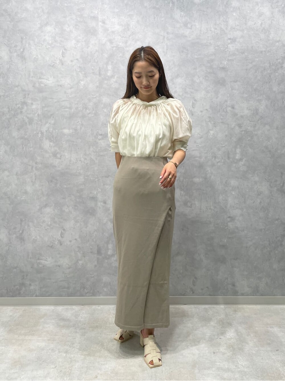 女性らしいオフィスコーデ。 【トップス】パフスリーブとシアー素材が特徴のブラウス。インナーキャミソール付きで、程よい透け感を楽しむことができるアイテム。オフィスでも着やすいデザインです。バックリボンが異素材なのでおしゃれ見えします。ロールネックなので首元もスッキリ見せてくれ、ロング丈のボトムスとの相性も◎。 【スカート】毎年大人気の接触冷感素材のニットシリーズ!通気性も、伸縮性も抜群なのでとにかく履き心地最高です。オンオフどちらも着こなせる万能スカートなので一枚持っているとコーディネートの幅がぐんと広がります☆ 【シューズ】編み上げになっているお洒落なサンダル。程よい肌見せにぴったりで小柄な方にもおすすめです。カジュアルなスタイルにも、綺麗めなスタイルにも相性抜群◎。クッション強めなので履き心地も良いです!