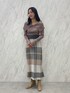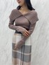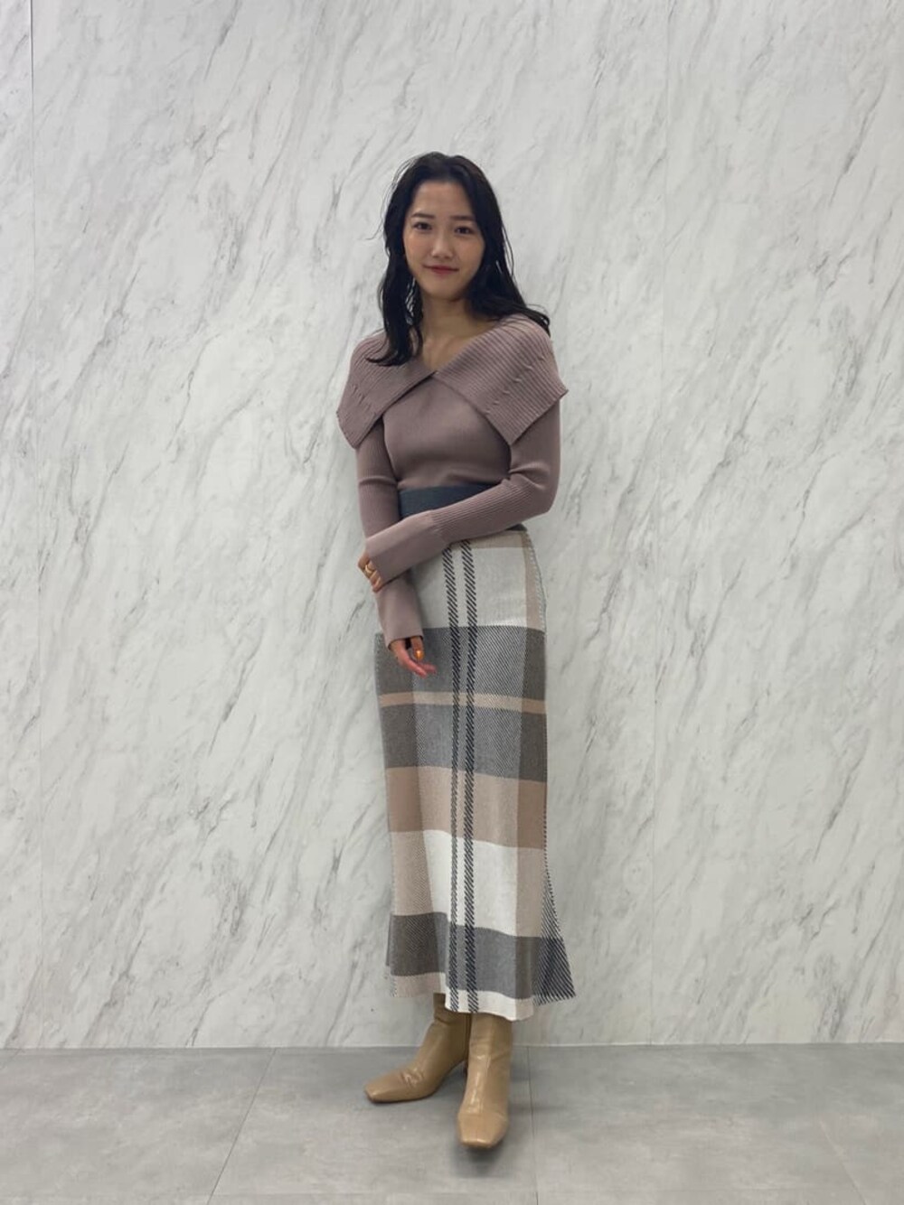 チェックを使った秋のデートコーデ。【トップス】トレンド感のあるビックカラーが小顔効果、二の腕のカバー全てを叶えてくれるニット。デコルテを綺麗に見せてくれこれ一枚で女性らしい印象になります。デニムなどのカジュアルなボトムスと合わせても可愛い♡ 【スカート】オリジナルチェックがアクセントになるニットタイトスカート。柄が入っていることで腰周り気にせず着ていただけます。またニット生地なので自分の体型に馴染むのもポイント! ほどよいマーメイドラインが女性らしく見せてくれます。【ブーツ】ラグナムーンのスタッフなら絶対1足は持っているブーツ!安定感のあるヒールなので長時間の使用でも疲れずに履けます!どんなスタイリングにも合わせやすい万能ブーツです。