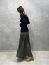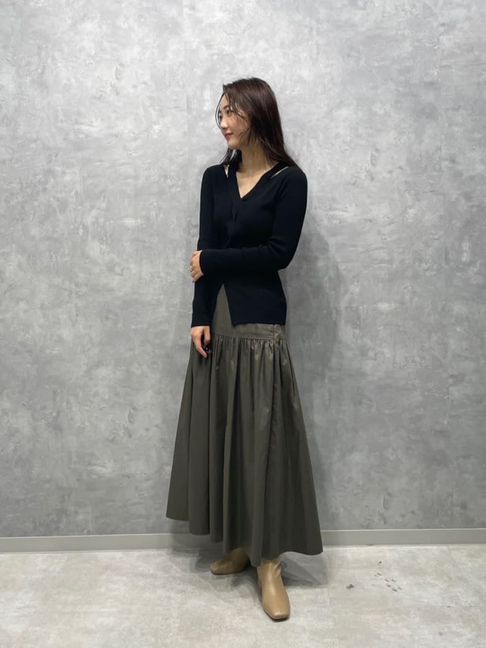 秋のモードコーデ。 【トップス】レーヨン混のサラッとした着心地のニット。カッティングが入っているのでアウトでも、もちろんインでも着ていただけます。着るだけで手が長く見え、ロング丈のボトムスと合わせるととってもスタイルが良く見えます♡ 【スカート】光沢のある生地を使用しているので丈が長くても重く見えないのがポイントのスカート。深めにスリットも入っているので小柄な方でも履けます◎。ウエストは比較的ゆったりサイズです!【ブーツ】ラグナムーンのスタッフなら絶対1足は持っているブーツ!安定感のあるヒールなので長時間の使用でも疲れずに履けます!どんなスタイリングにも合わせやすい万能ブーツです。