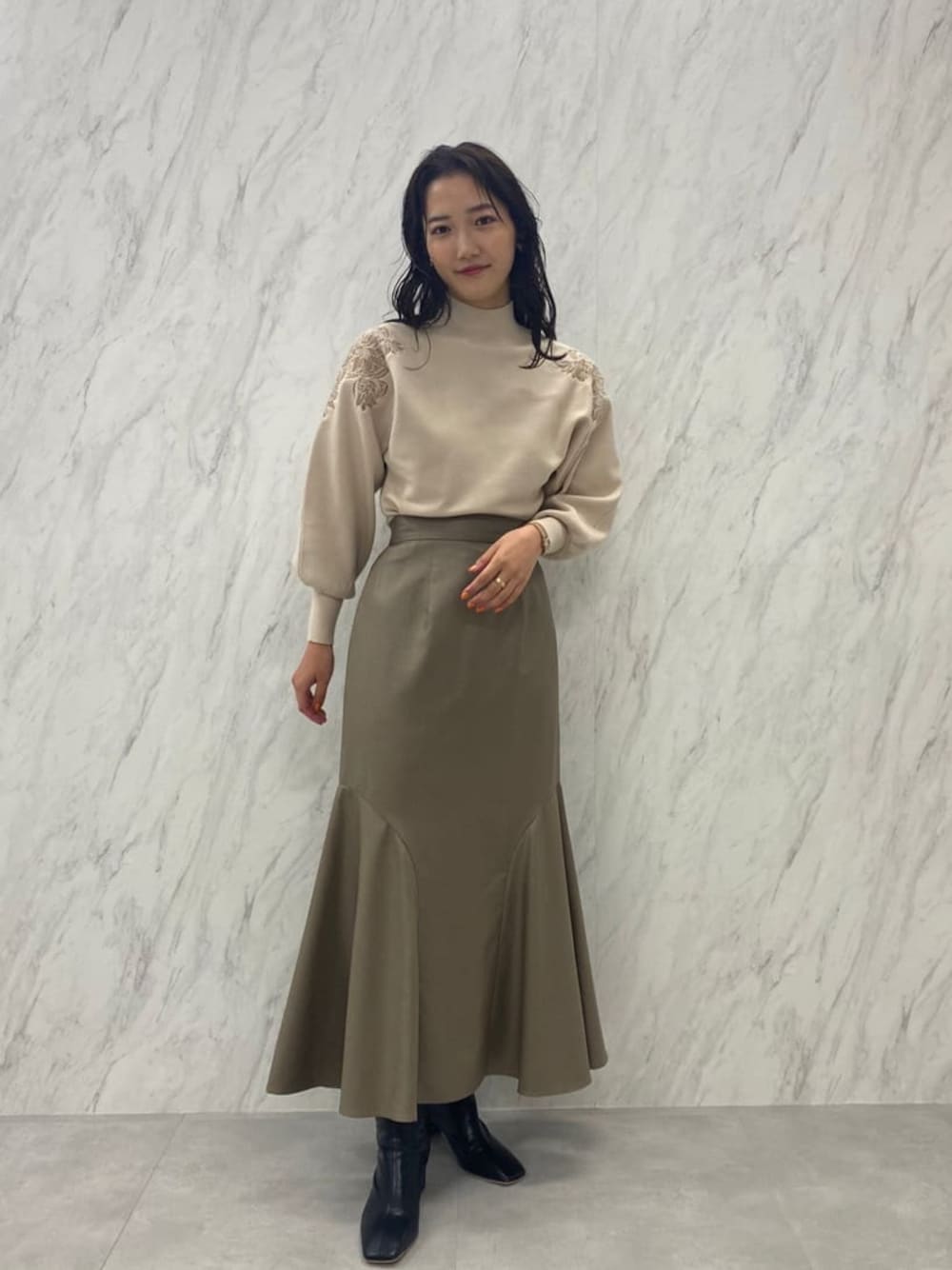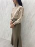 ブラウントーンのマーメイドスカートコーデ。 【ニット】店頭で大人気のショルダーレースがポイントのニット!手洗い可能で毛玉が全くできないという最強ニットです。ドルマンスリーブなので袖を少し上げるとタプッとしたシルエットになり可愛い♡ レースも一部分のみなので甘すぎずに着ていただけます◎。着心地もよく二色買いされるお客様も多いアイテムです! 【スカート】マーメイドシルエットが体のラインを綺麗に見せてくれるスカート。落ち感のあるすっきりとしたスカートなのでオーバーサイズのニットとも相性抜群です!光沢感があるので丈が長くても重く見えません◎。 【ブーツ】ラグナムーンのスタッフなら絶対1足は持っているブーツ!安定感のあるヒールなので長時間の使用でも疲れずに履けます!どんなスタイリングにも合わせやすい万能ブーツです。