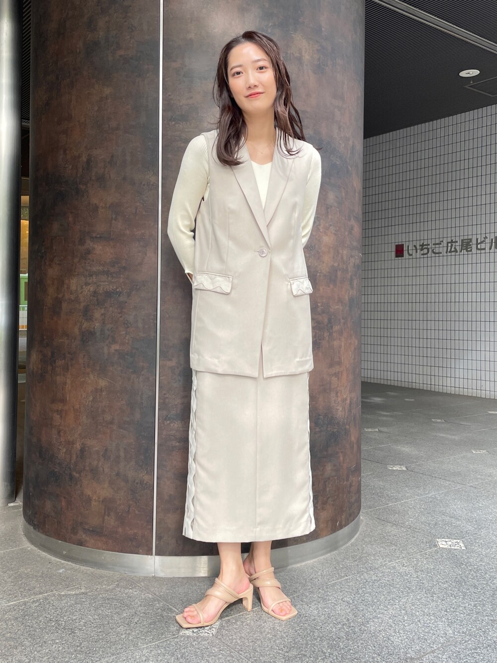 おしゃれなセットアップコーデ。 【ニット】デコルテを綺麗に見せてくれる女性らしい印象のニット。袖のカッティングがおしゃれ!白でも透け感なく一枚でも安心して着ていただけます。 【ベスト】腰回りをカバーしてくれる丈感のベスト。これ一枚でレイヤードスタイルが簡単にできる!ポケットのデザインに一癖あるのがポイントです。 【スカート】ウエストの一番細い部分で止まってくれるのでとっても細見えするタイトスカート。サイドのテープが視覚効果でさらに腰回りをカバーしてくれます。透け感も全くないので安心! 【サンダル】ぷっくりとしたフォルムが可愛いサンダル。どんなスタイリングにも合うので一つ持っていると春夏足元に困らない!