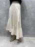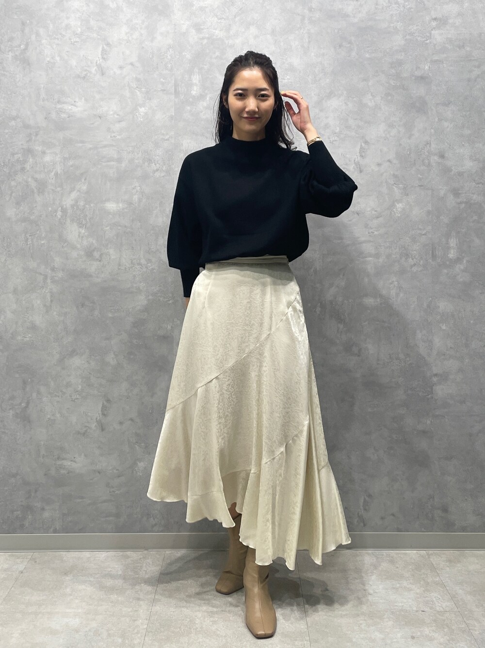 モノトーンコーデ。【トップス】毎年大人気のニット。とにかく肌触りが良く、2色買いされてる方、リピートされる方がダントツで多いアイテム!首の詰まりも気にならずお仕事着として使われるお客様も多いです。お手入れもしやすいので、一枚持っているとコーデの幅がぐんと広がります♪ 【スカート】ほんのり柄の入ったロングスカート。アシンメトリーのデザインがお洒落見えさせてくれます! 【ブーツ】ラグナムーンのスタッフなら絶対1足は持っているブーツ!安定感のあるヒールなので長時間の使用でも疲れずに履けます!どんなスタイリングにも合わせやすい万能ブーツです。