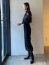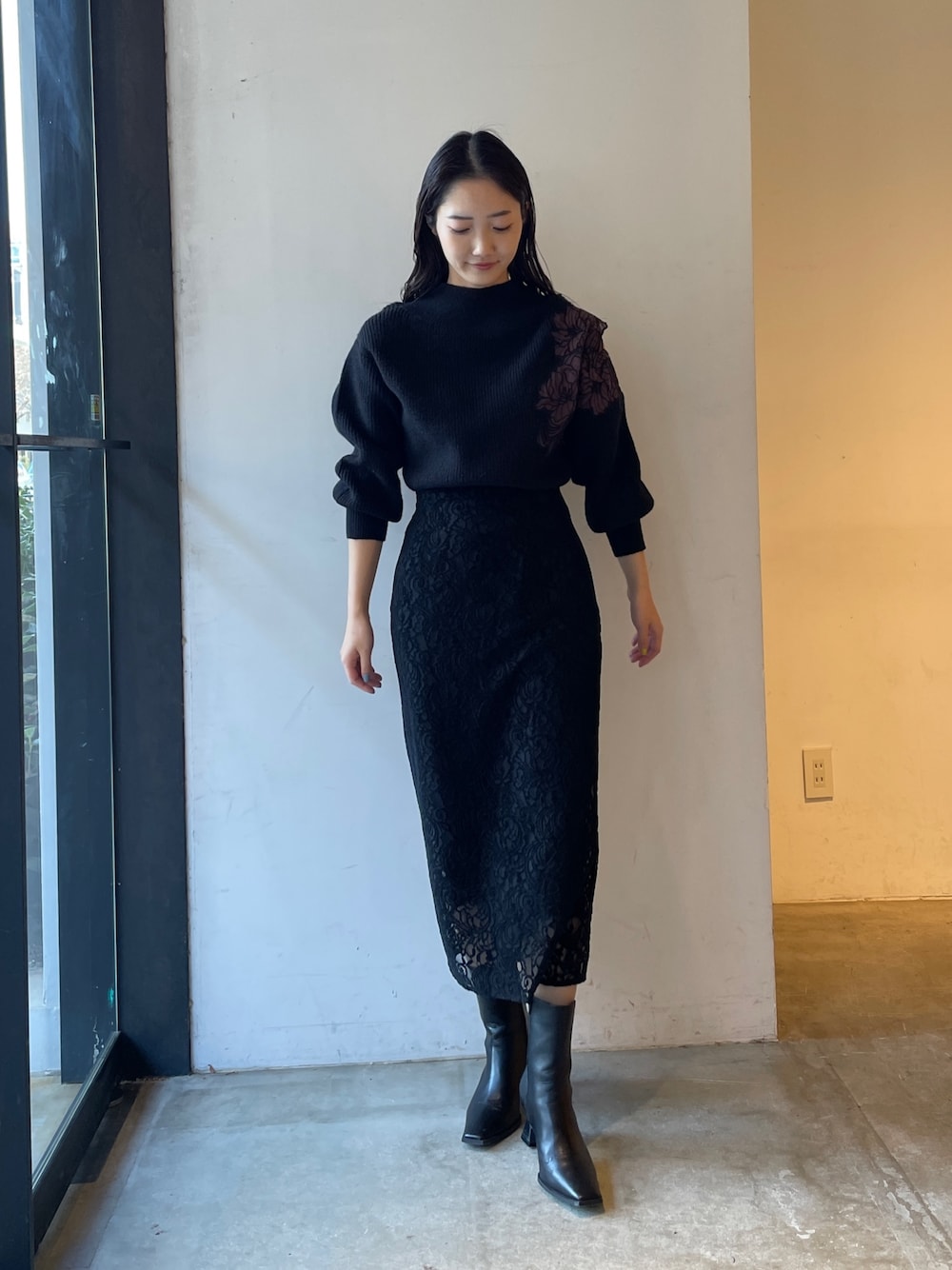大人のブラックコーデ。【ニット】バイカラーのレースがお洒落なニット。レースが一部なので派手すぎずボトムスも合わせやすいデザイン!肩幅が気になる肩にもおすすめのアイテムです。 【スカート】大柄なレースが目を惹くタイトスカート。生地感がしっかりしているので下着のラインがまったくみえない!安心して着ていただけます。 微配カラーの裏地がレースの存在感を惹きたてます。ウエストがゴムなのと、後ろにスリットが入っているので動きやすく着心地もいいです! 【ブーツ】安定感のあるヒールなので長時間の使用でも疲れずに履けます!どんなスタイリングにも合わせやすい万能ブーツです。
