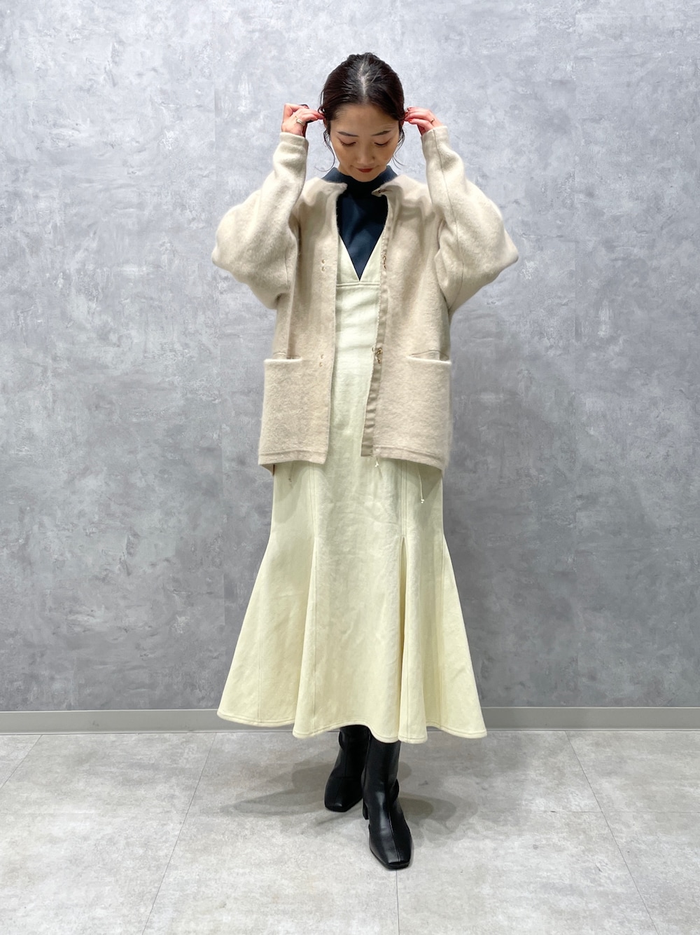 女性らしいデニムコーデ。【カーディガン】裏地までお洒落な配色になっている大人気カーディガン。腕まくりしても可愛いです!ラクーンニットは保温性が高くとにかく暖かいのが特徴!どんなコーデにも羽織れる万能アイテムなので持っていて絶対損なしです!【ワンピース】着るだけで細く見せてくれるデニムジャンパースカート。マーメイドスカートが綺麗に体のラインを見せてくれます。甘めが苦手、、、という方でもブラックなら挑戦しやすい!シンプルなTシャツと合わせても可愛いです! 【トップス】毎年大人気のニット。とにかく肌触りが良く、2色買いされてる方、リピートされる方がダントツで多いアイテム!首の詰まりも気にならずお仕事着として使われるお客様も多いです。お手入れもしやすいので、一枚持っているとコーデの幅がぐんと広がります♪ 【ブーツ】ラグナムーンのスタッフなら絶対1足は持っているブーツ!安定感のあるヒールなので長時間の使用でも疲れずに履けます!どんなスタイリングにも合わせやすい万能ブーツです。