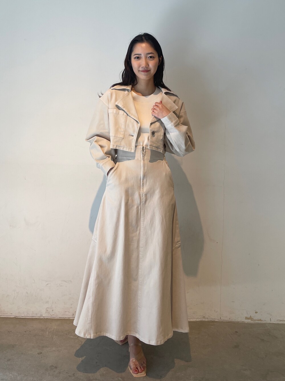 デニムコーデ。【トップス】ラグナムーン定番のサマーニット。接触冷感素材なので真夏も汗がペタつかず、とても着心地がいいアイテム。シンプルなデザインなのでどんなアイテムにも合わせられる万能ニット◎ 【ジャケット】シマロン×ラグナムーン コラボのアイテム。とにかく伸縮性に優れているためデニムジャケット特有のつっぱり感がゼロ!着心地抜群なアイテムです。 【スカート】マーメイドスカートに挑戦してみたいけど腰回りが気になる、あまり似合わない、と言う方に是非履いて欲しいアイテム!伸縮性のある生地なのでとっても履きやすい!体型、身長問わずに着用できます。程よく厚みのある生地なので腰回りをカバーしてくれるマーメイドスカートです。ジャケットとセットできるのが一番可愛い! 【サンダル】柔らかいクリア素材を使用したサンダル。どんなスタイリングにも合うので一つ持っていると春夏足元に困らない!