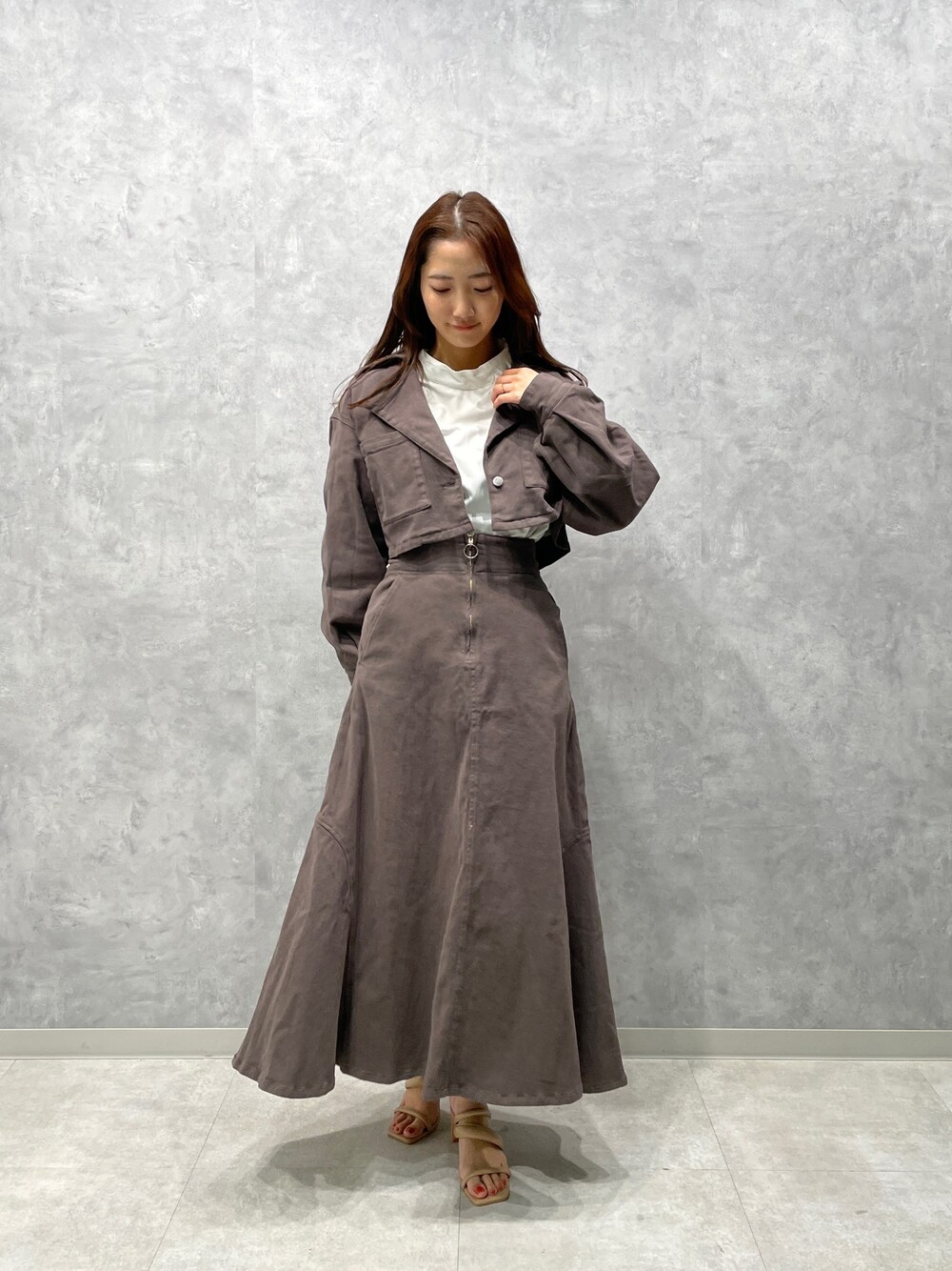 デニムコーデ【ジャケット】シマロン×ラグナムーン コラボのアイテム。とにかく伸縮性に優れているためデニムジャケット特有のつっぱり感がゼロ!着心地抜群なアイテムです。 【トップス】肩のさりげない肌見せがポイントのブラウス。ハリのあるブラウスなのでカチッとした印象で着られます! 【スカート】マーメイドスカートに挑戦してみたいけど腰回りが気になる、あまり似合わない、と言う方に是非履いて欲しいアイテム!伸縮性のある生地なのでとっても履きやすい!体型、身長問わずに着用できます。程よく厚みのある生地なので腰回りをカバーしてくれるマーメイドスカートです。ジャケットとセットできるのが一番可愛い! 【サンダル】ぷっくりとしたフォルムが可愛いサンダル。どんなスタイリングにも合うので一つ持っていると春夏足元に困らない!