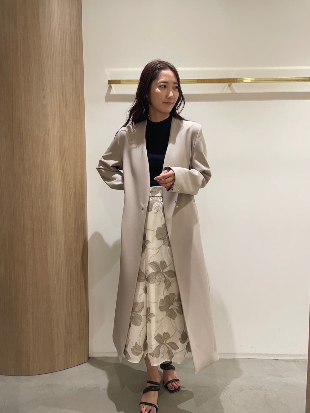 春のデートコーデ。【コート】ラグナムーンで毎年大人気のノーカラートレンチコート。通勤やお休みの日はもちろん、オケージョンコーデとの相性も抜群なアイテム。どんなスタイリングとも合うので持っていて損なし!【トップス】ヘルシーな肌見せがおしゃれなニット。肩の切り返しデザインも珍しくて可愛い♥春から秋まで着用可能です! 【スカート】大きな花柄が存在感があるのでコーデの主役にぴったりのスカート。シアー素材なので抜け感も出ます。【サンダル】ぷっくりとしたフォルムが可愛いサンダル。どんなスタイリングにも合うので一つ持っていると春夏足元に困らない!