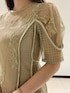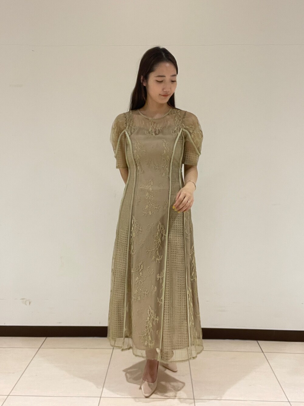 【ドレス】レースを何種類か使用したナロードレス。深みのあるカラーが落ち着いている印象になり、年を重ねてもずっと使えるアイテムです。162cm、Sサイズ着用でこの丈感!丈は長めですが裾のシアーがあることで抜け感がでて 、152cmのスタッフでもバランスよく着用できていました◎ 【パンプス】普段ヒール履かない私でも履きやすくてオススメのパンプス。クッション強めなのでとっても歩きやすくサテン生地が足元をオシャレに見せてくれます