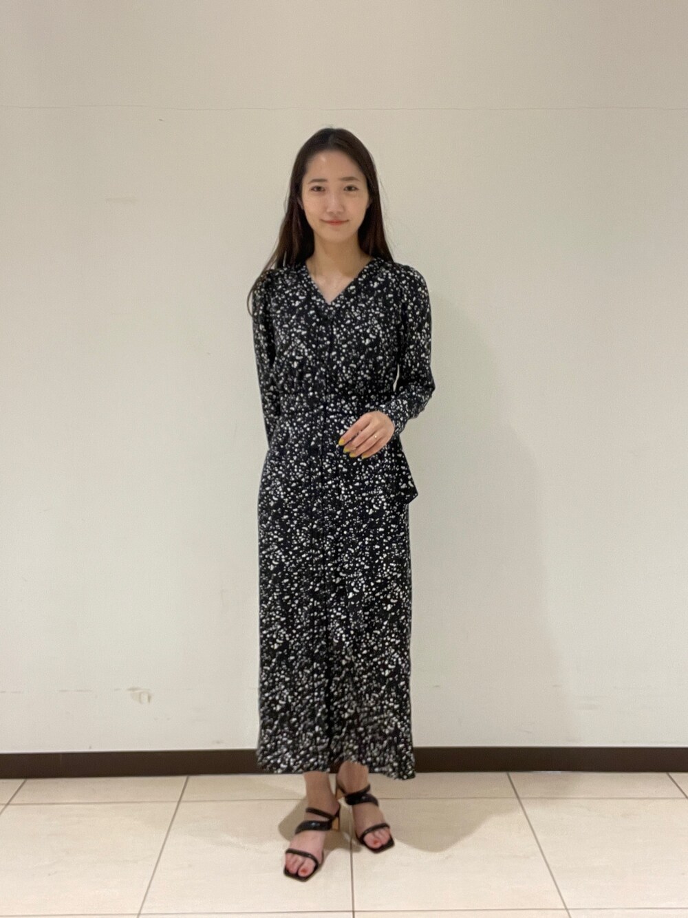 春のワンピースコーデ。【ワンピース】腰のメローデザインがあることでお洒落見えするワンピース。本当に着るだけで細見えします。ランダムな柄も甘く見えずに見えるポイント◎。【サンダル】ぷっくりとしたフォルムが可愛いサンダル。どんなスタイリングにも合うので一つ持っていると春夏足元に困らない!