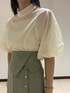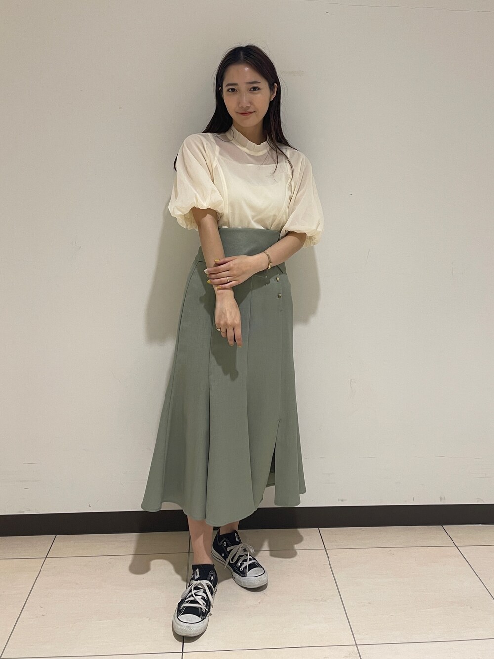 オフィスコーデ。 【トップス】パフスリーブとシアー素材が特徴のブラウス。インナーキャミソール付きで、程よい透け感を楽しむことができるアイテム。オフィスでも着やすいデザインです。インナーがセットで付いてくるので下着の心配もいらない◎ 【スカート】ラインが縦に入っているので腰回りをすっきりと見せてくれるマーメイドスカート。ウエストマークもしっかりあるのも安心!