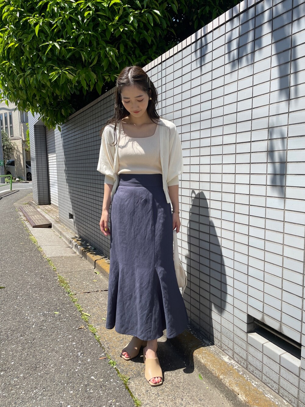 【カーディガン】UVカット付きのカーディガン。脇部分が広めなのでパフスリーブなどのボリュームがあるトップスの上からも楽々羽織れます⚪︎。とっても小さく畳めるので通勤や旅行にピッタリ! シンプルなインナーを着て前ボタンを止めるとトップスとしても着用可能です! 【スカート】リネン素材のマーメイドスカート。シルエットは細身で綺麗めな印象ですが、素材がリネンなのでカジュアルな着こなしも合います!