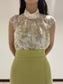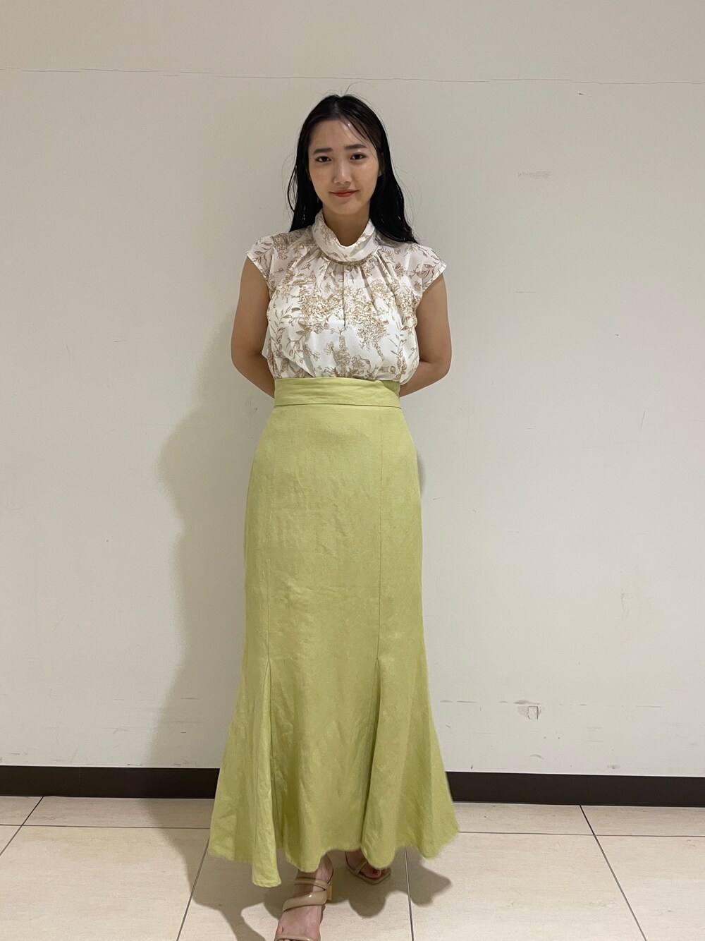 透明感あふれるブラウスコーデ。【ブラウス】流行りの甘すぎないジュイ柄のブラウス。ハイネックなので花柄なのにモードな雰囲気でも着られます!肩に少し布がかかっているので露出感も少なく着やすい◎。 【スカート】リネン素材のマーメイドスカート。シルエットは細身で綺麗めな印象ですが、素材がリネンなのでカジュアルな着こなしも合います!【サンダル】ぷっくりとしたフォルムが可愛いサンダル。どんなスタイリングにも合うので一つ持っていると春夏足元に困らない!