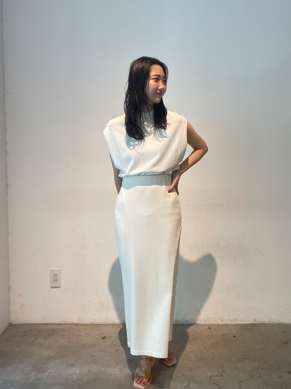 【ニット】接触冷感シリーズの万能トップス。店頭では2色買いされる方続出の人気アイテムです。二の腕をさりげなく隠してくれるのですっきり細見えさせてくれるのが嬉しいポイント! 【スカート】毎年大人気の接触冷感素材のニットシリーズ!通気性も、伸縮性も抜群なのでとにかく履き心地最高です。オンオフどちらも着こなせる万能スカートなので一枚持っているとコーディネートの幅がぐんと広がります☆ 【サンダル】柔らかいクリア素材を使用したサンダル。どんなスタイリングにも合うので一つ持っていると春夏足元に困らない!