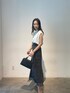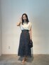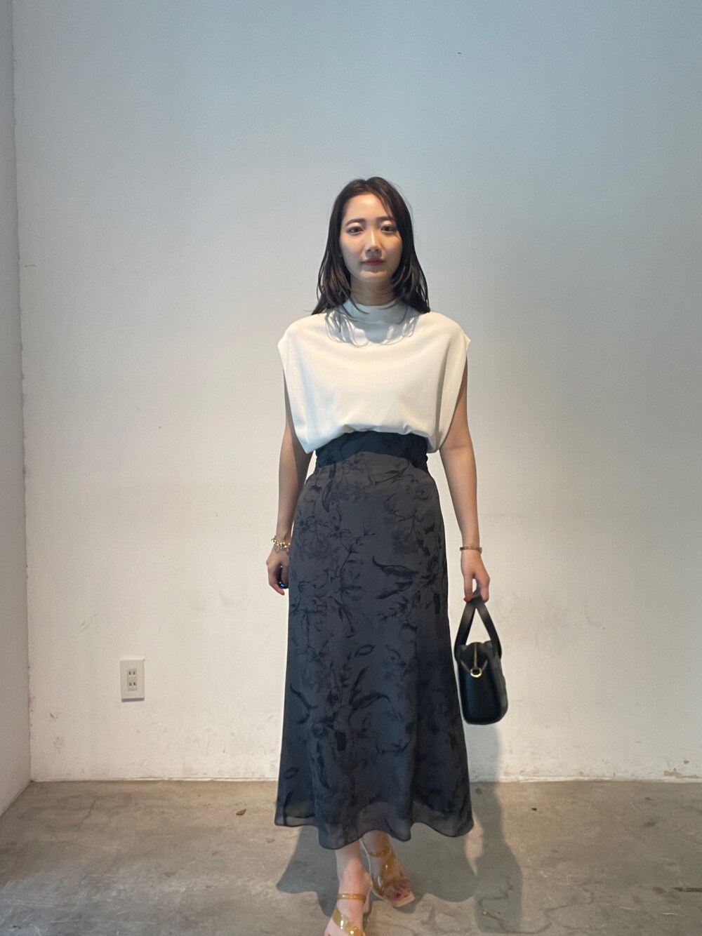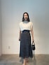 【ニット】接触冷感シリーズの万能トップス。店頭では2色買いされる方続出の人気アイテムです。二の腕をさりげなく隠してくれるのですっきり細見えさせてくれるのが嬉しいポイント! 【スカート】風合いのある柄がおしゃれなスカート。色味も落ち着いたくすみベージュなので花柄でも甘くならず女性らしく着こなせます。バックにはボタンがついておりインスタイルがおしゃれ!162センチSサイズ着用でこの丈感。ロング好きにはたまらない! 【サンダル】柔らかいクリア素材を使用したサンダル。どんなスタイリングにも合うので一つ持っていると春夏足元に困らない!