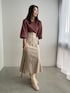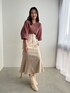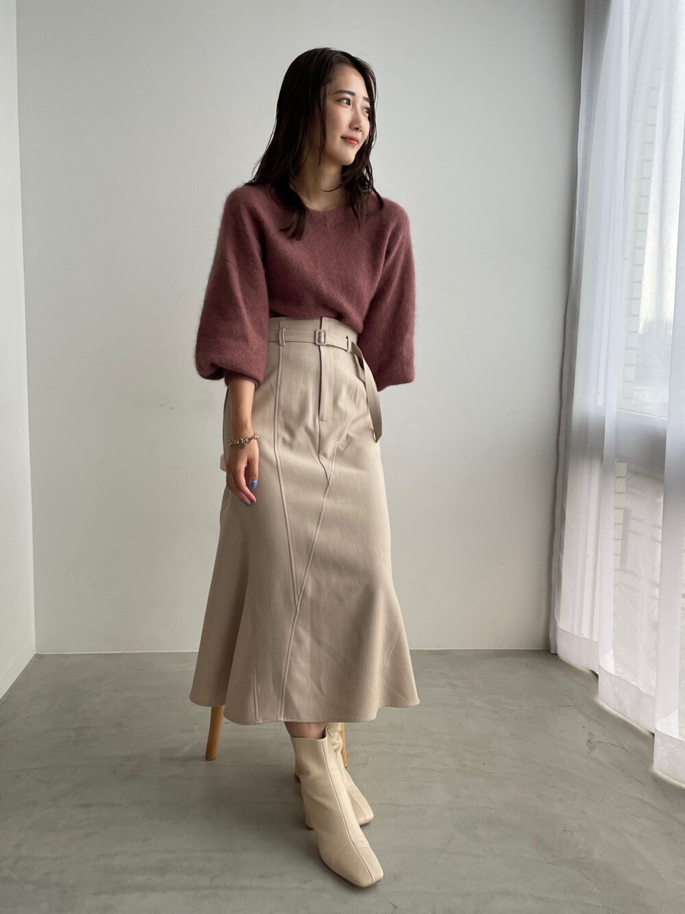 【トップス】起毛感があり、柔らかく優しい肌触りのラクーンを使用しているので着心地抜群!密度が高いので暖かいのが特徴です。 シンプルながら品の良い存在感がありデコルテラインが女性らしさを惹きたてます。 【スカート】ウエストマークがポイントになっているのでシンプルなトップスと合わせてもおしゃれ見えするスカート。ハイウエストなので脚長効果も抜群です!シーズン問わず着られます◯ 【ブーツ】ラグナムーンのスタッフなら絶対1足は持っているブーツ!安定感のあるヒールなので長時間の使用でも疲れずに履けます!どんなスタイリングにも合わせやすい万能ブーツです。