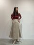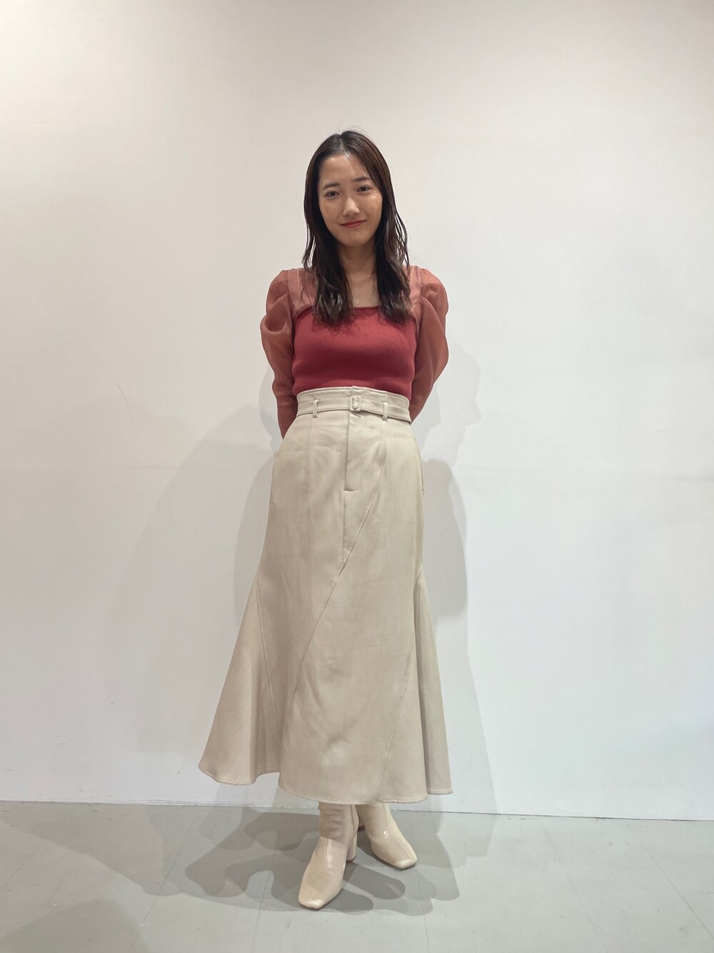 【トップス】スクエアネックがデコルテを綺麗に見せてくれるトップス。顔周りがすっきりと見えるのでロング丈のボトムスも相性抜群です。下着を変えなくても透け感が楽しめるアイテム! 【スカート】ウエストマークがポイントになっているのでシンプルなトップスと合わせてもおしゃれ見えするスカート。ハイウエストなので脚長効果も抜群です!シーズン問わず着られます◯ 【ブーツ】ラグナムーンのスタッフなら絶対1足は持っているブーツ!安定感のあるヒールなので長時間の使用でも疲れずに履けます!どんなスタイリングにも合わせやすい万能ブーツです。