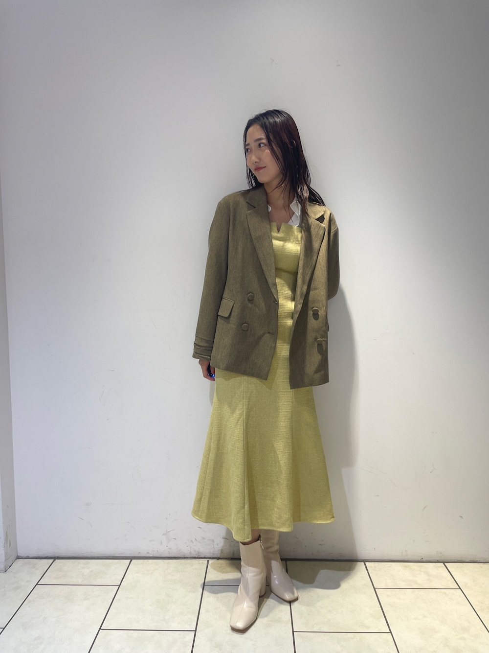 【ジャケット】厚手のしっかりとした生地感のジャケット。セレモニー用などカチッとさせたいスタイリングにも、カジュアルなスタイリングにもぴったりです。 【ワンピース】シャツ×ニットのドッキングデザインなので一枚で主役級のワンピース。細身なサイズ感なので小柄な方におすすめです!ウエストのくびれが自然にできるシルエットなのがポイント。 【ブーツ】ラグナムーンのスタッフなら絶対1足は持っているブーツ!安定感のあるヒールなので長時間の使用でも疲れずに履けます!どんなスタイリングにも合わせやすい万能ブーツです。