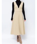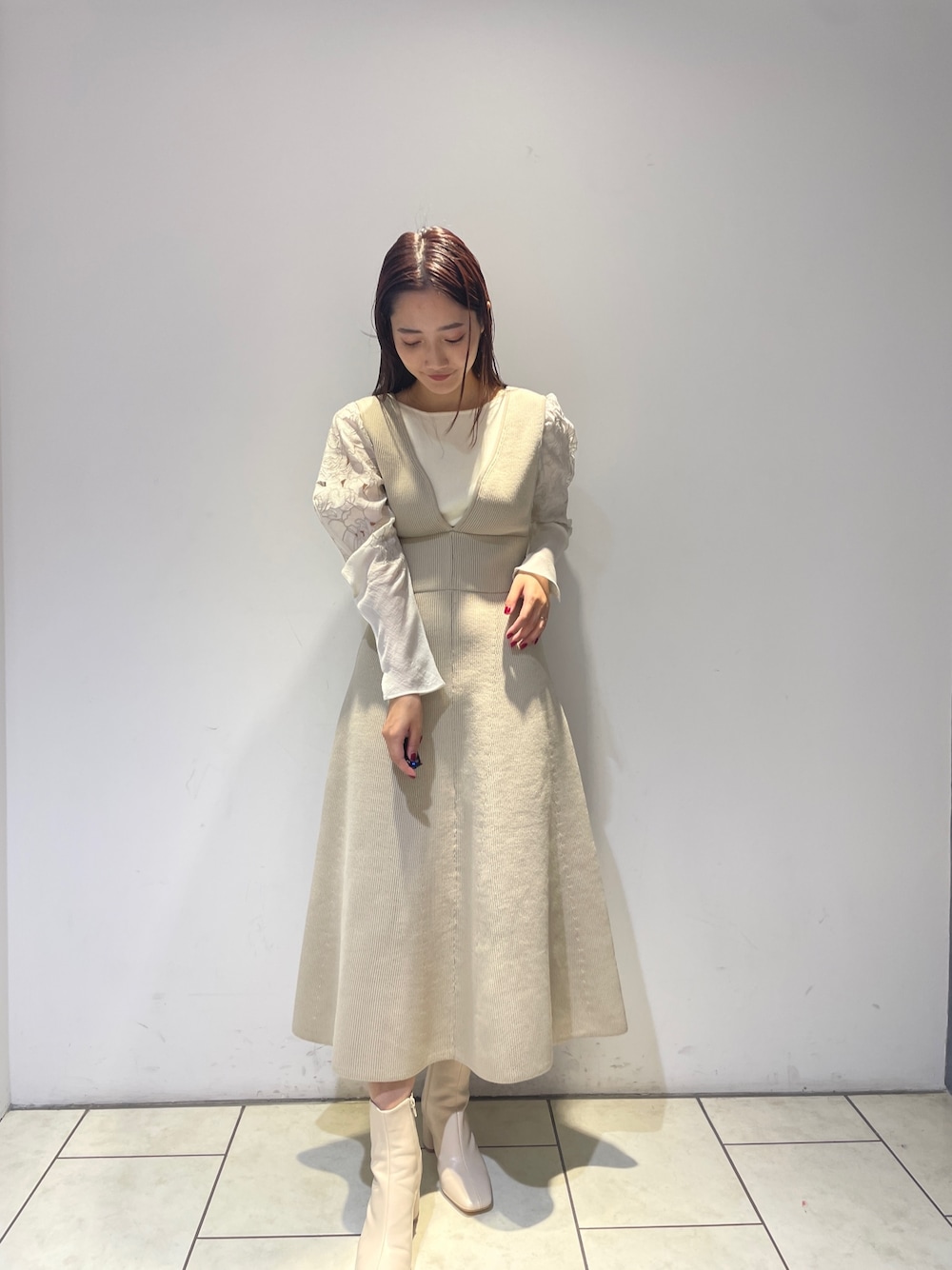 【スカート】インナー次第で着回しのできるジャンパースカート。程よいハリのあるニット生地なので腰回りをすっきり見せてくれ安心して着れます。ウエストマークが太く位置も高めなのでスタイルアップ効果あり◎。【ニット】袖のエンブロイダリーレースが華やかに見せてくれる1着。袖だけシアー素材なのでインナーも困らずに着られます◎ 【ブーツ】ラグナムーンのスタッフなら絶対1足は持っているブーツ!安定感のあるヒールなので長時間の使用でも疲れずに履けます!どんなスタイリングにも合わせやすい万能ブーツです。