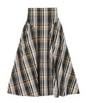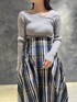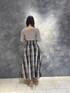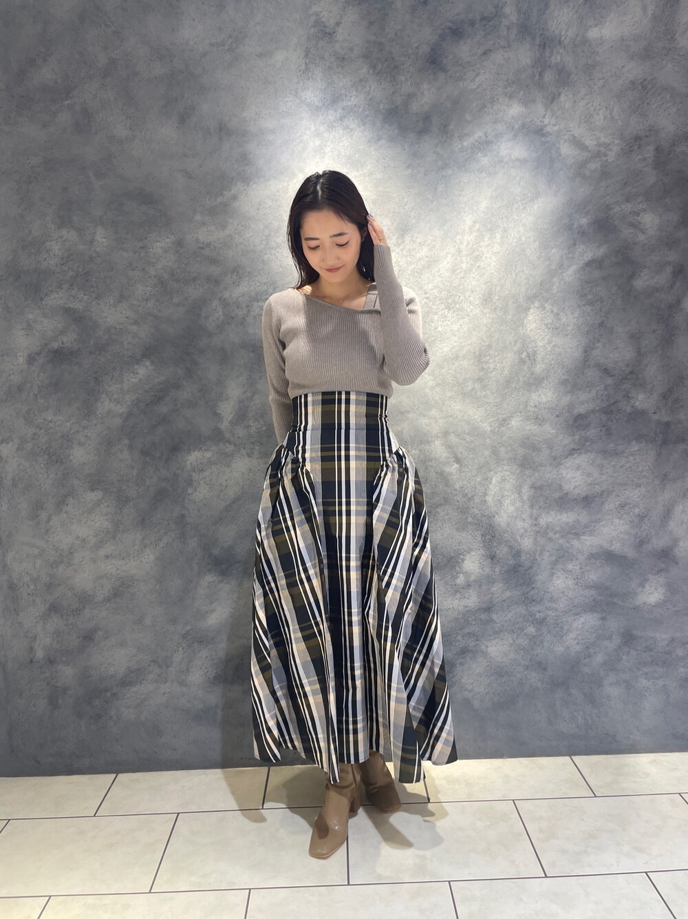 【トップス】デコルテを程よく見せてくれる女性らしいニット。アシンメトリーデザインなのでシンプルなボトムスに合わせてもおしゃれに見える万能アイテム!【ブーツ】ラグナムーンのスタッフなら絶対1足は持っているブーツ!安定感のあるヒールなので長時間の使用でも疲れずに履けます!どんなスタイリングにも合わせやすい万能ブーツです。【スカート】たっぷり布を使ったボリュームのあるロングスカート。大柄チェックが目を引く主役級のアイテムです。シンプルなトップス合わせがおすすめ!
