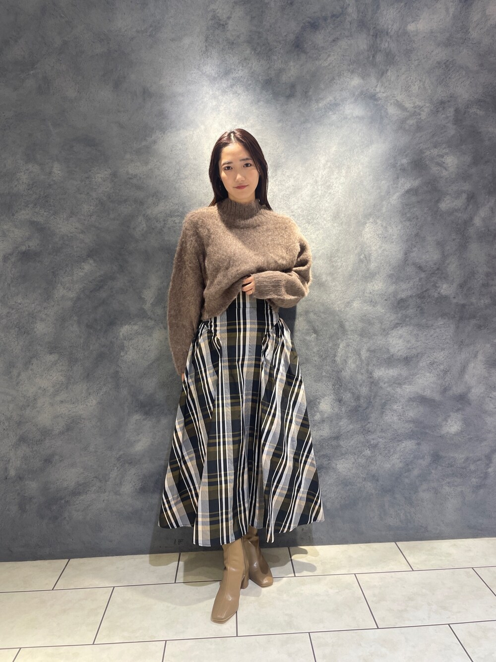 【スカート】たっぷり布を使ったボリュームのあるロングスカート。大柄チェックが目を引く主役級のアイテムです。シンプルなトップス合わせがおすすめ!【ブーツ】ラグナムーンのスタッフなら絶対1足は持っているブーツ!安定感のあるヒールなので長時間の使用でも疲れずに履けます!どんなスタイリングにも合わせやすい万能ブーツです。【ニット】アルパカ100%のニット素材なのでとにかく軽くて暖かいのが特徴!ショート丈なので着膨れせずすっきりとした柔らかい印象で着ていただけます◎。毛玉にもなりにくい強いお素材なので安心!